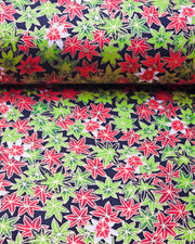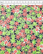This design features red, green, and white maples leaves on a black background with metallic gold accents.