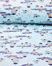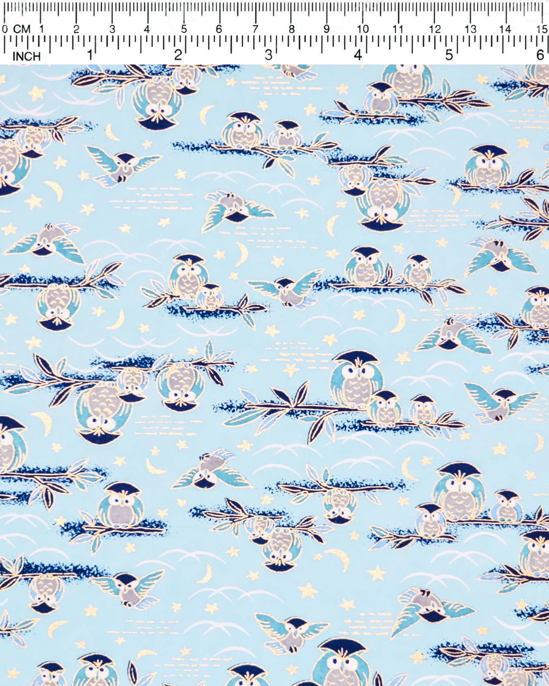 This design features blue and gray owls and gold stars and moons on a light blue background with metallic gold accents background.