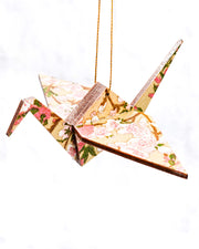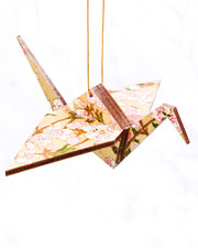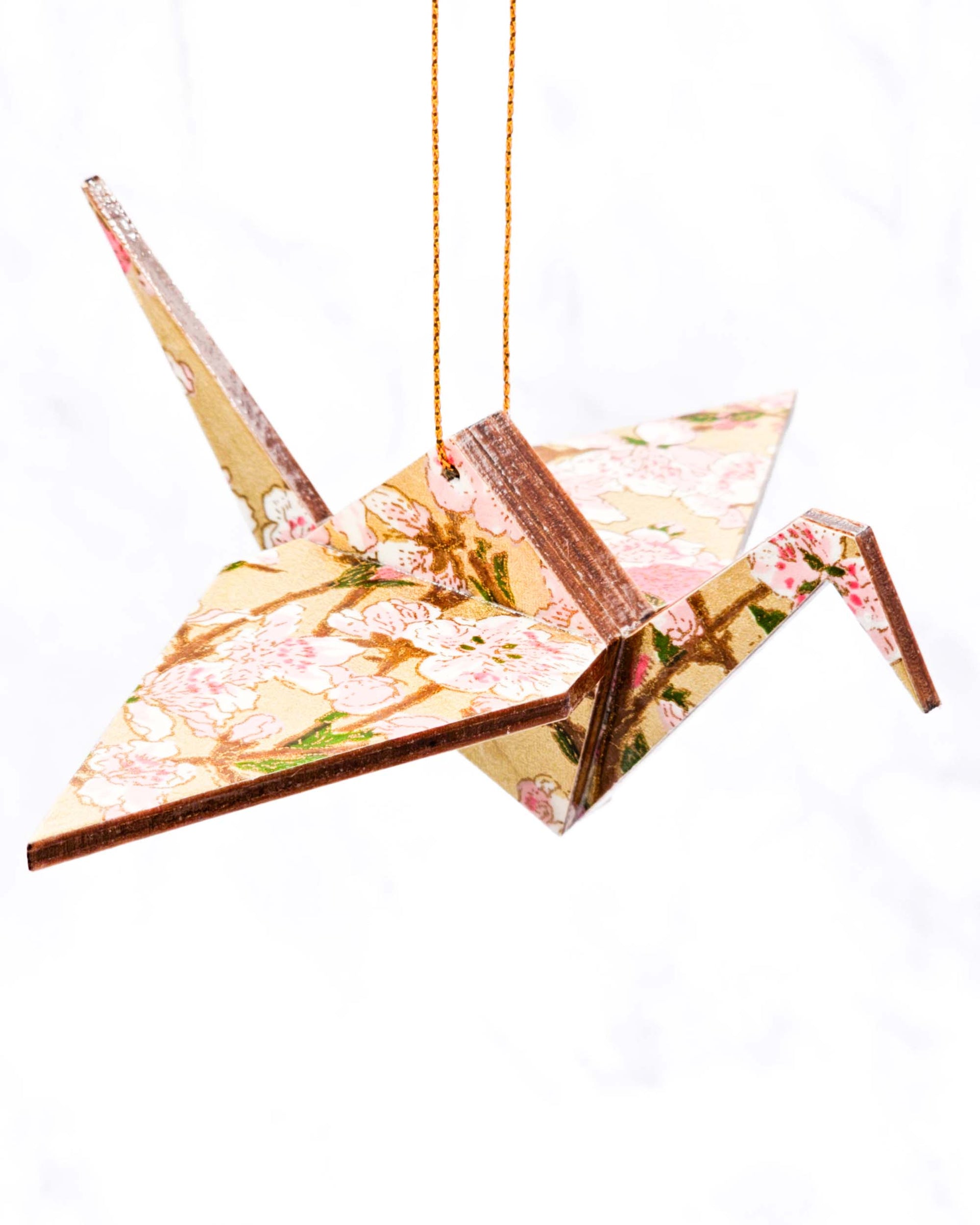 Wooden Origami Crane - Pink Plum Blossoms on Gold