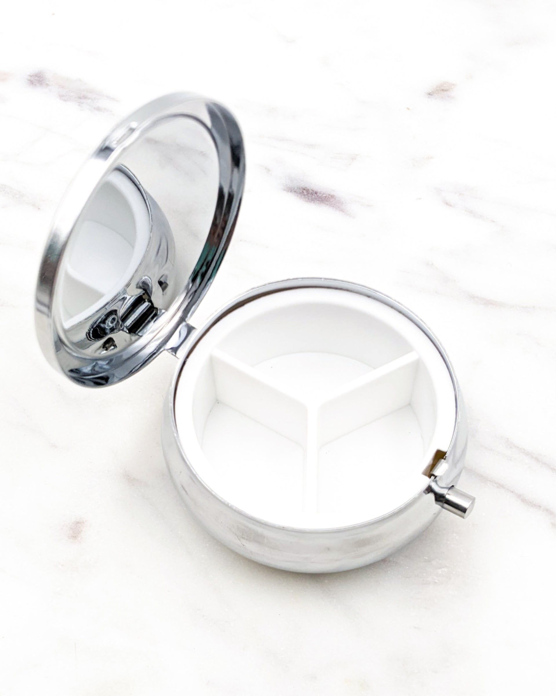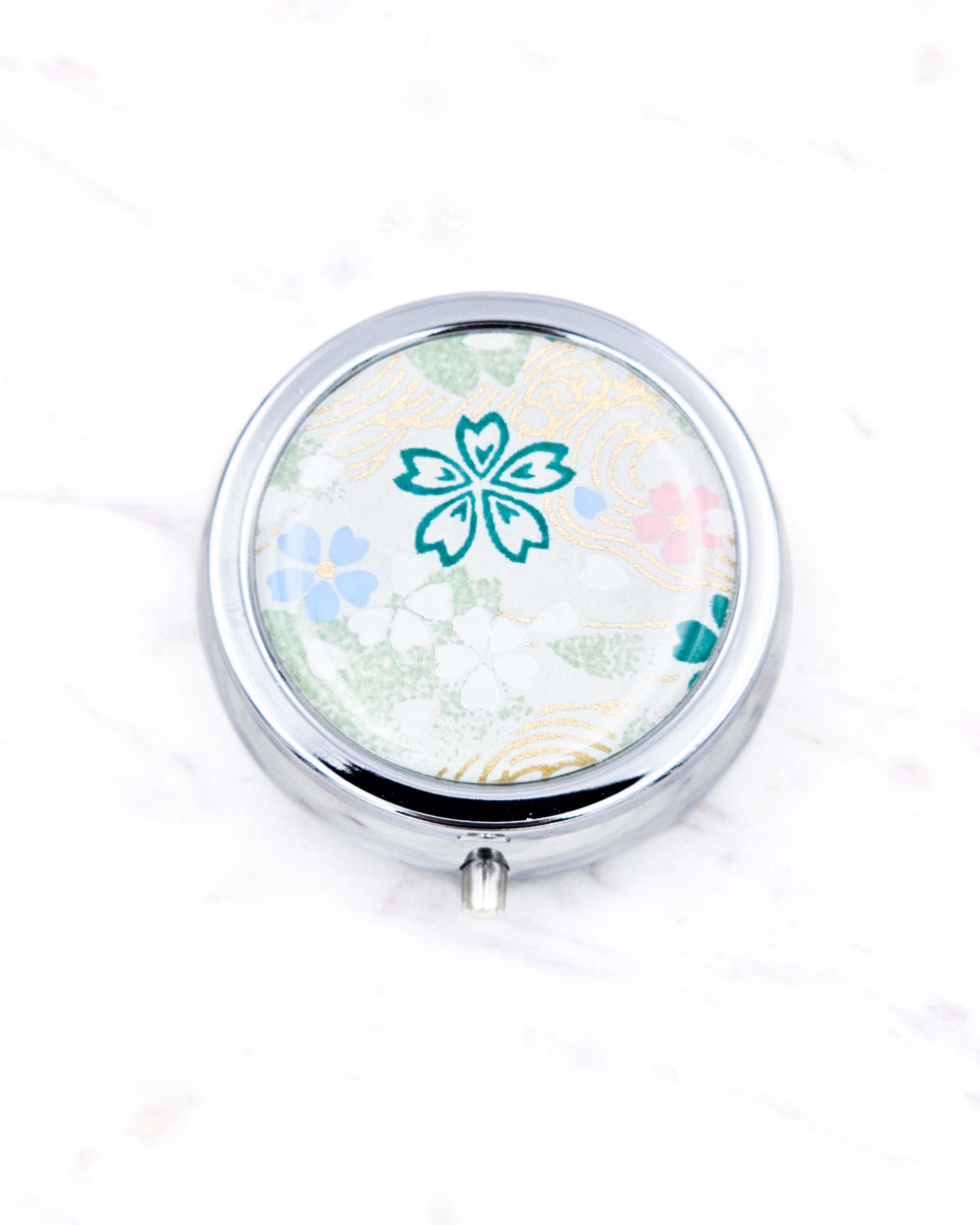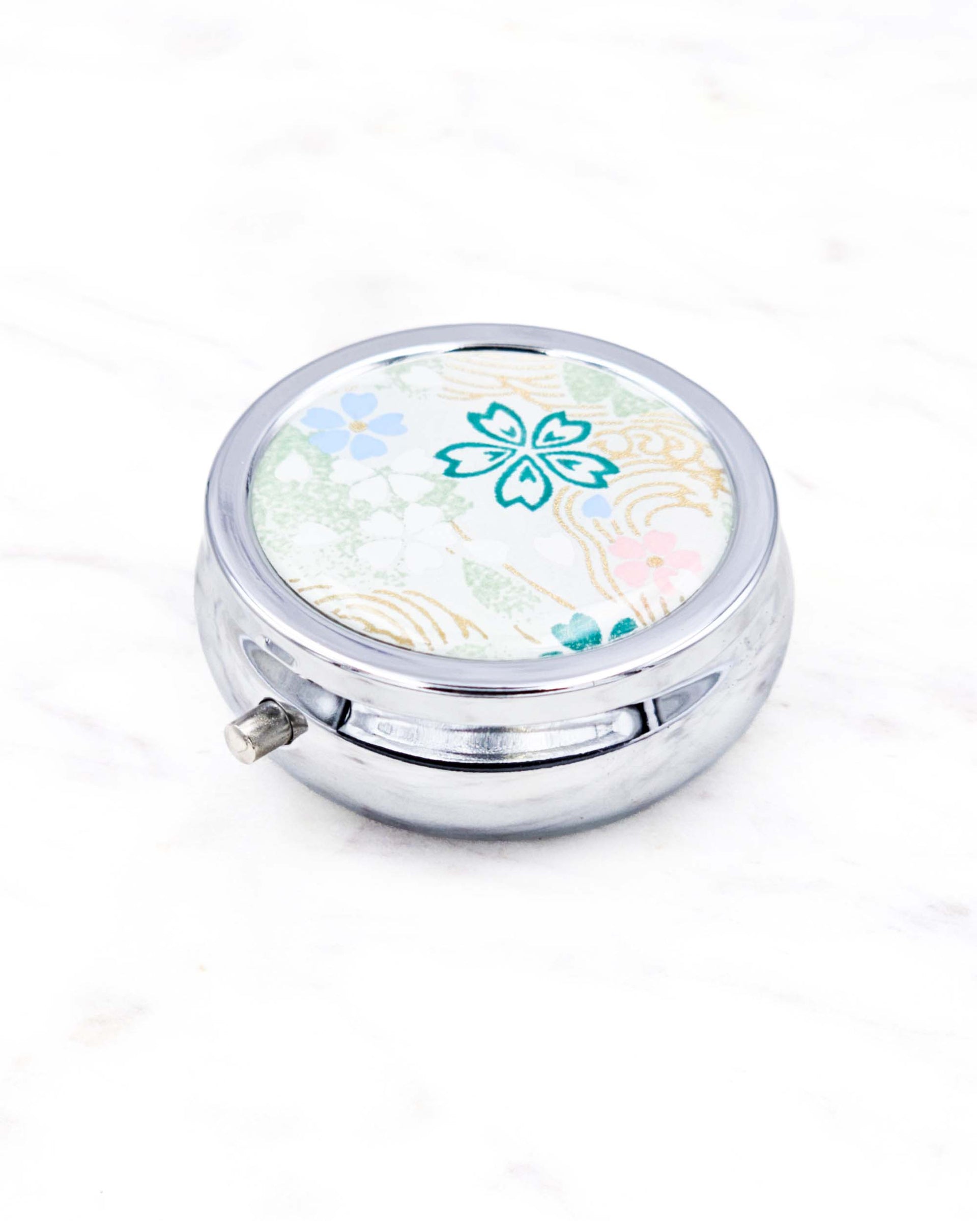 This silver folding metal pill box/case is decorated with beautiful authentic Japanese yuzen (chiyogami) paper. The design is protected under scratch resistant epoxy.
