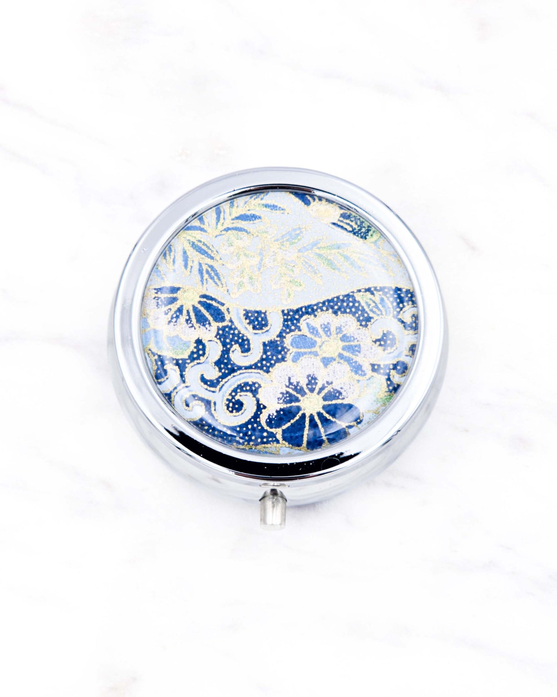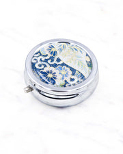 This silver folding metal pill box/case is decorated with beautiful authentic Japanese yuzen (chiyogami) paper. The design is protected under scratch resistant epoxy.