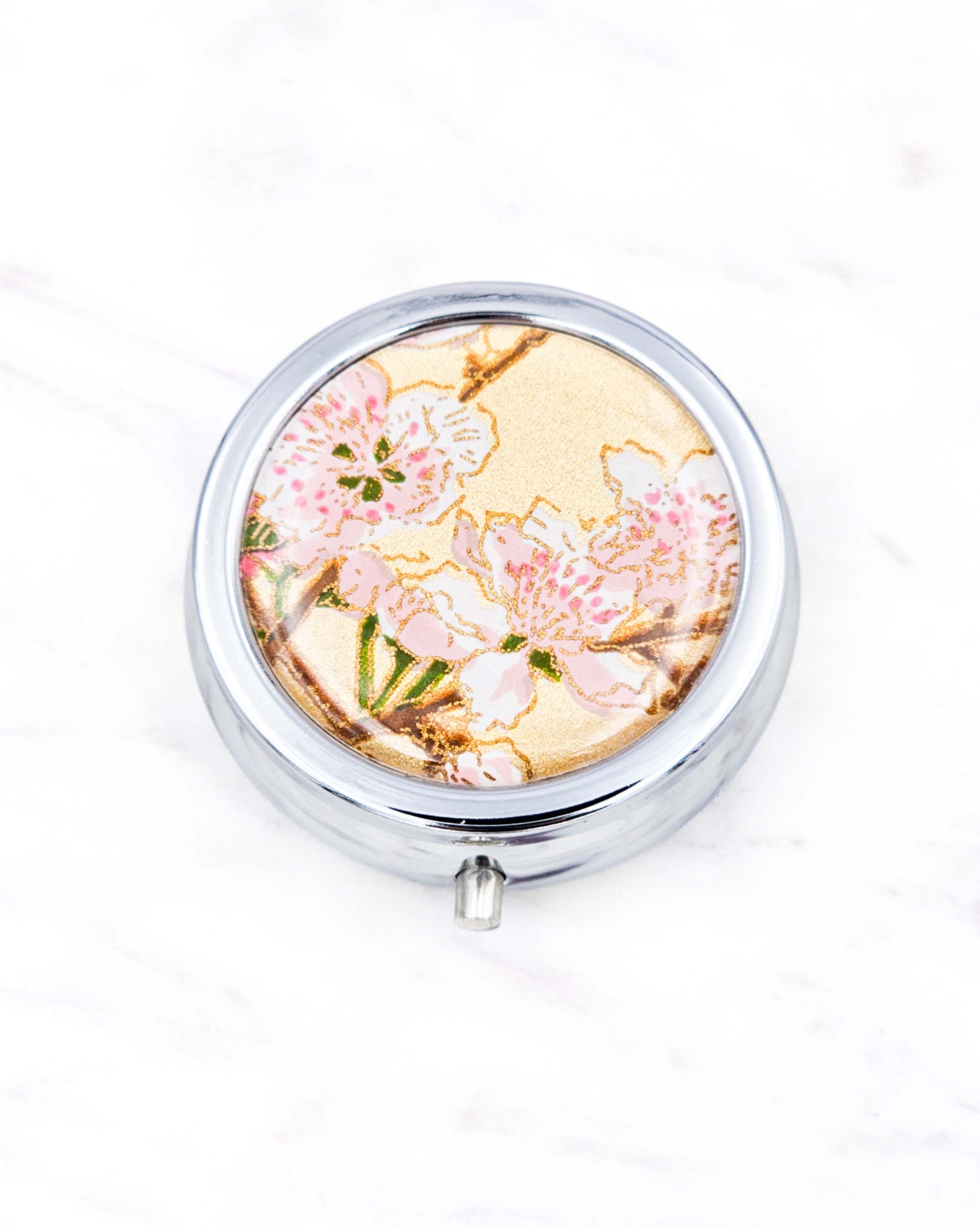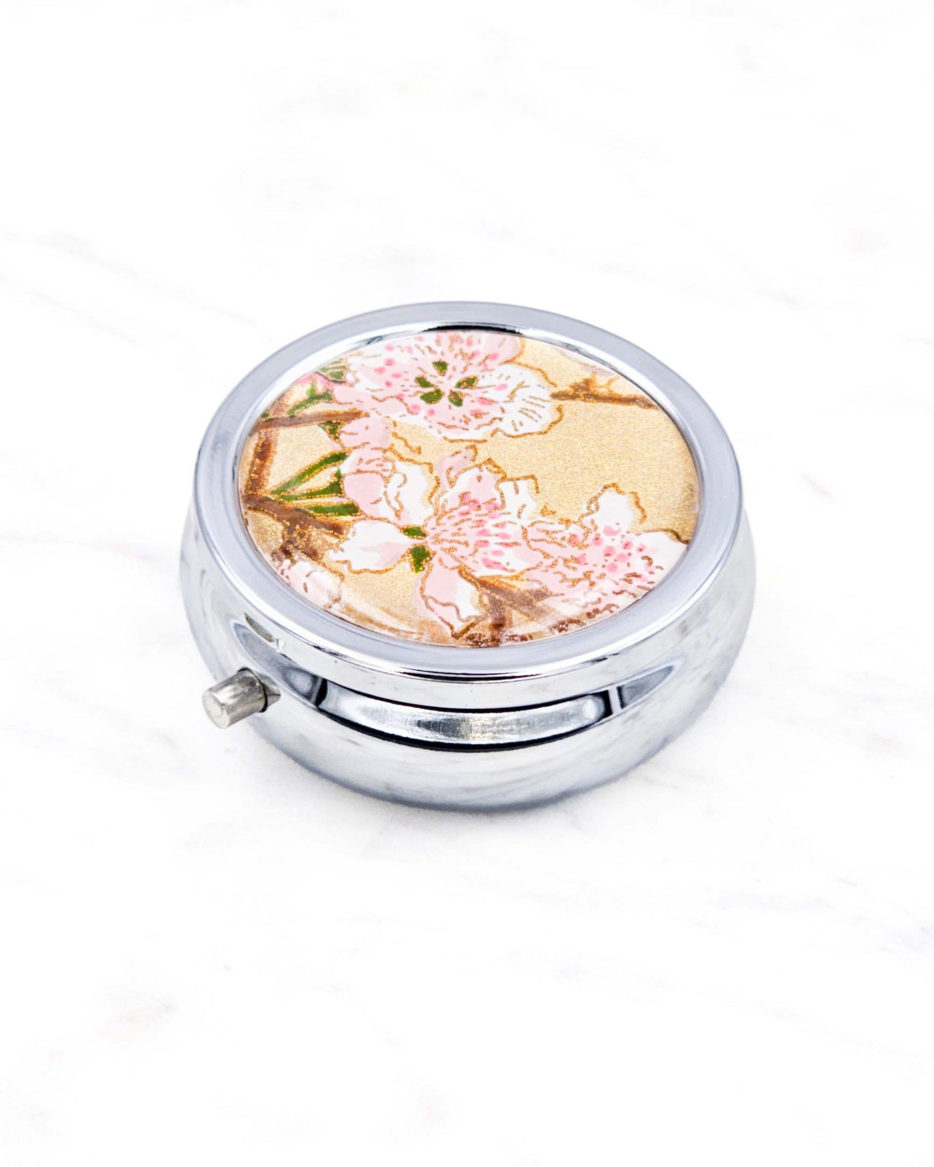 This silver folding metal pill box/case is decorated with beautiful authentic Japanese yuzen (chiyogami) paper. The design is protected under scratch resistant epoxy.