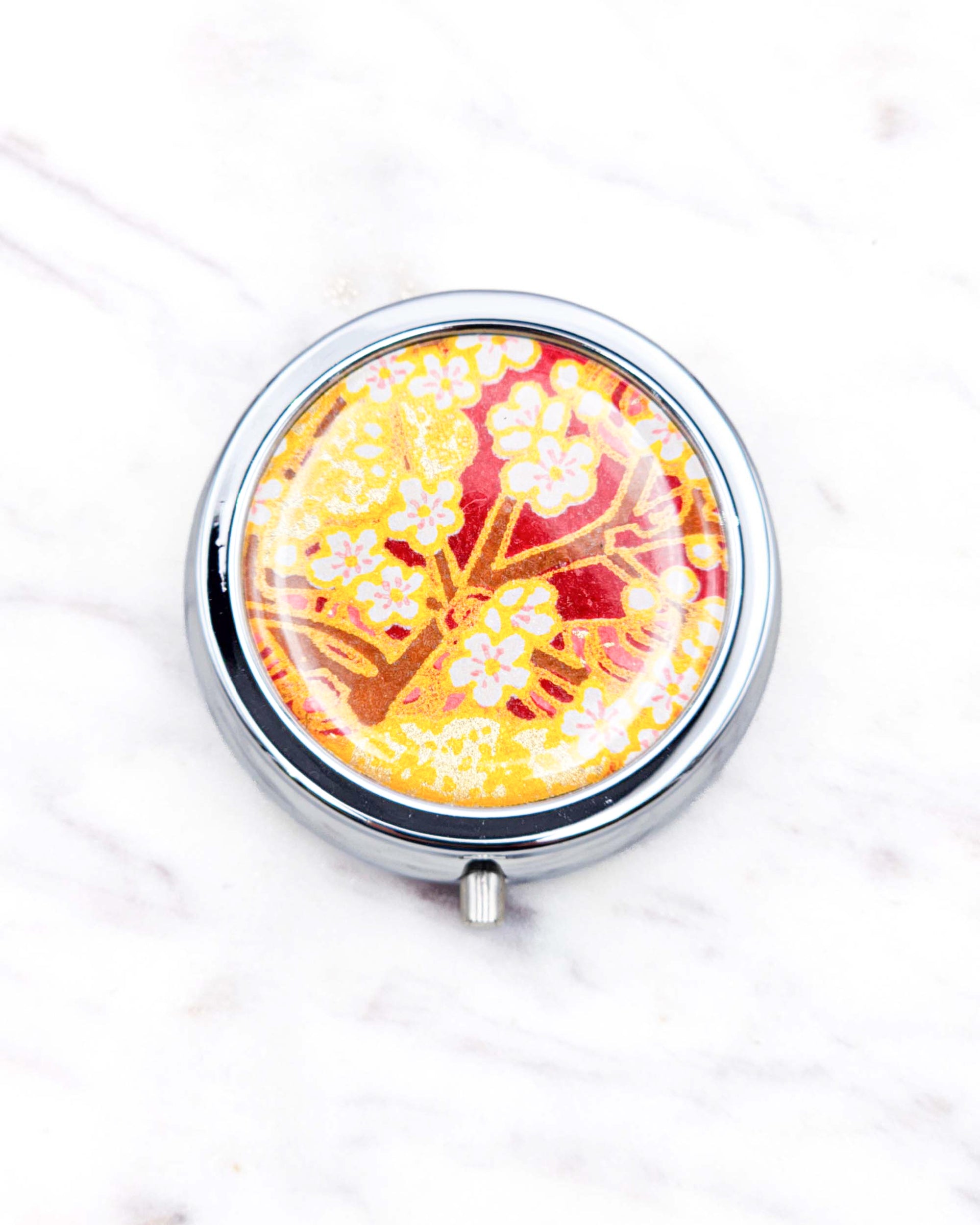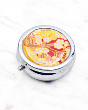 This silver folding metal pill box/case is decorated with beautiful authentic Japanese yuzen (chiyogami) paper. The design is protected under scratch resistant epoxy.