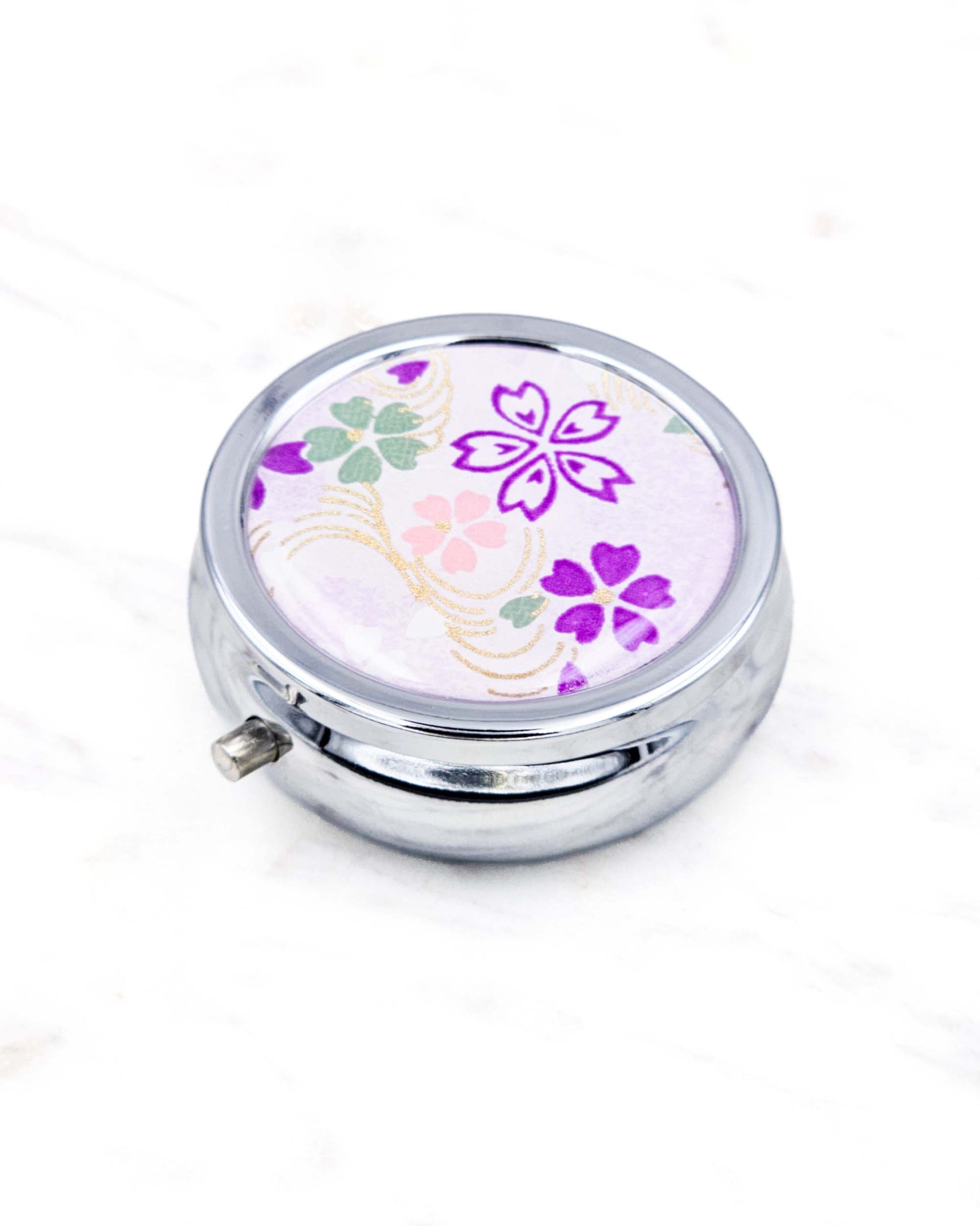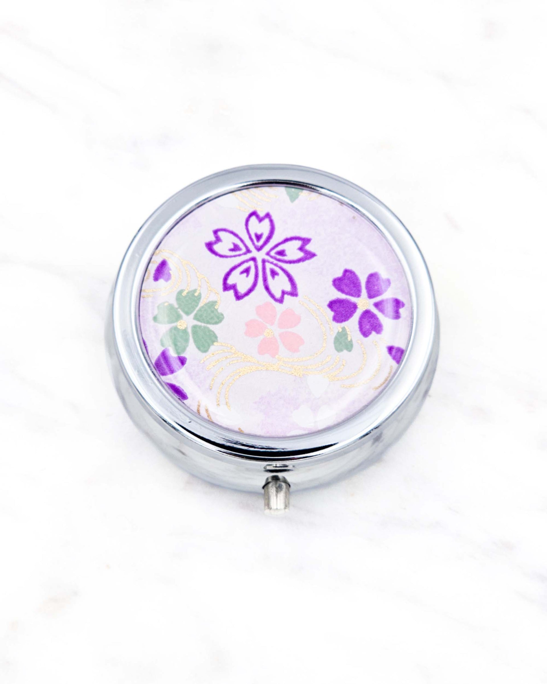 This silver folding metal pill box/case is decorated with beautiful authentic Japanese yuzen (chiyogami) paper. The design is protected under scratch resistant epoxy.