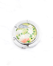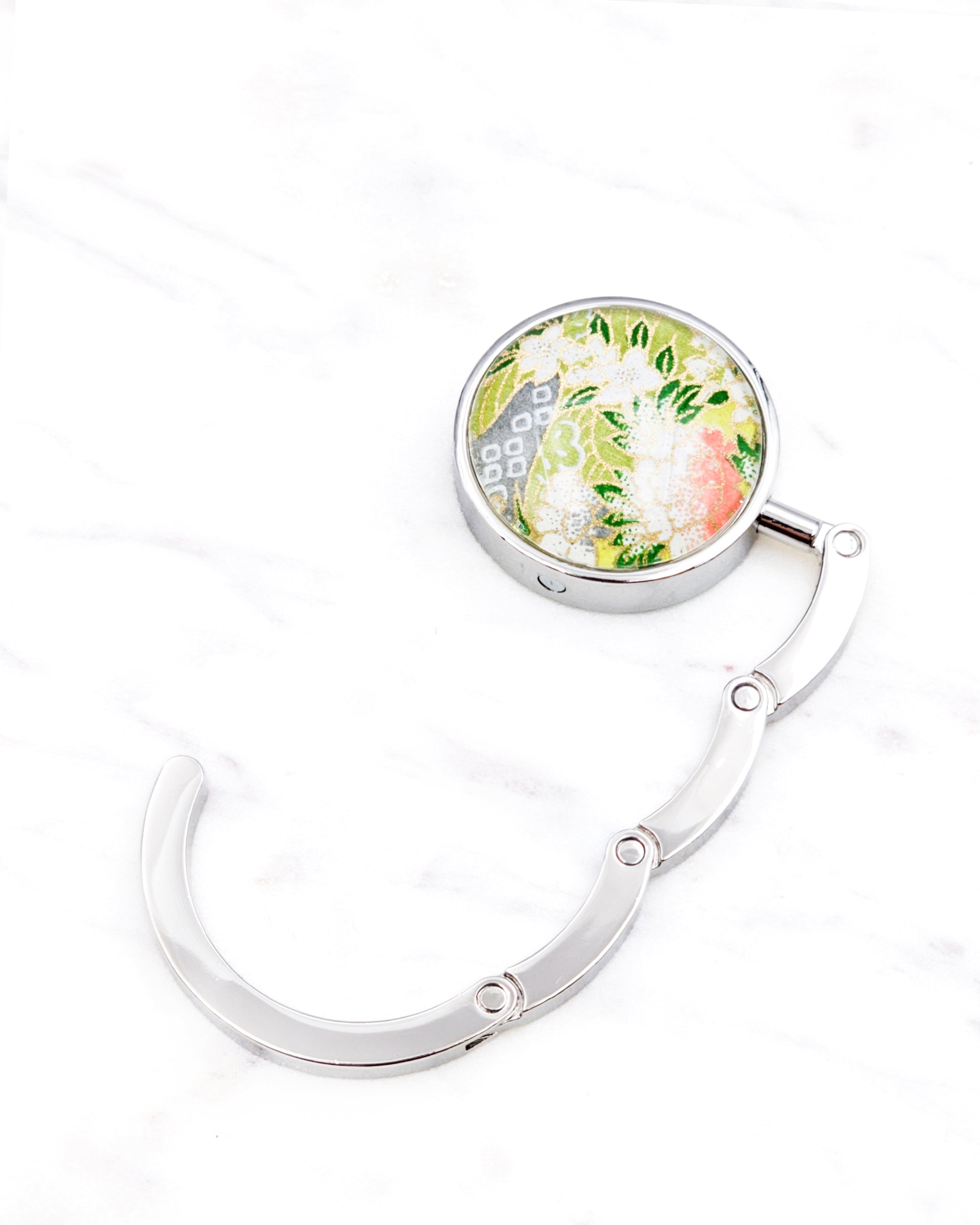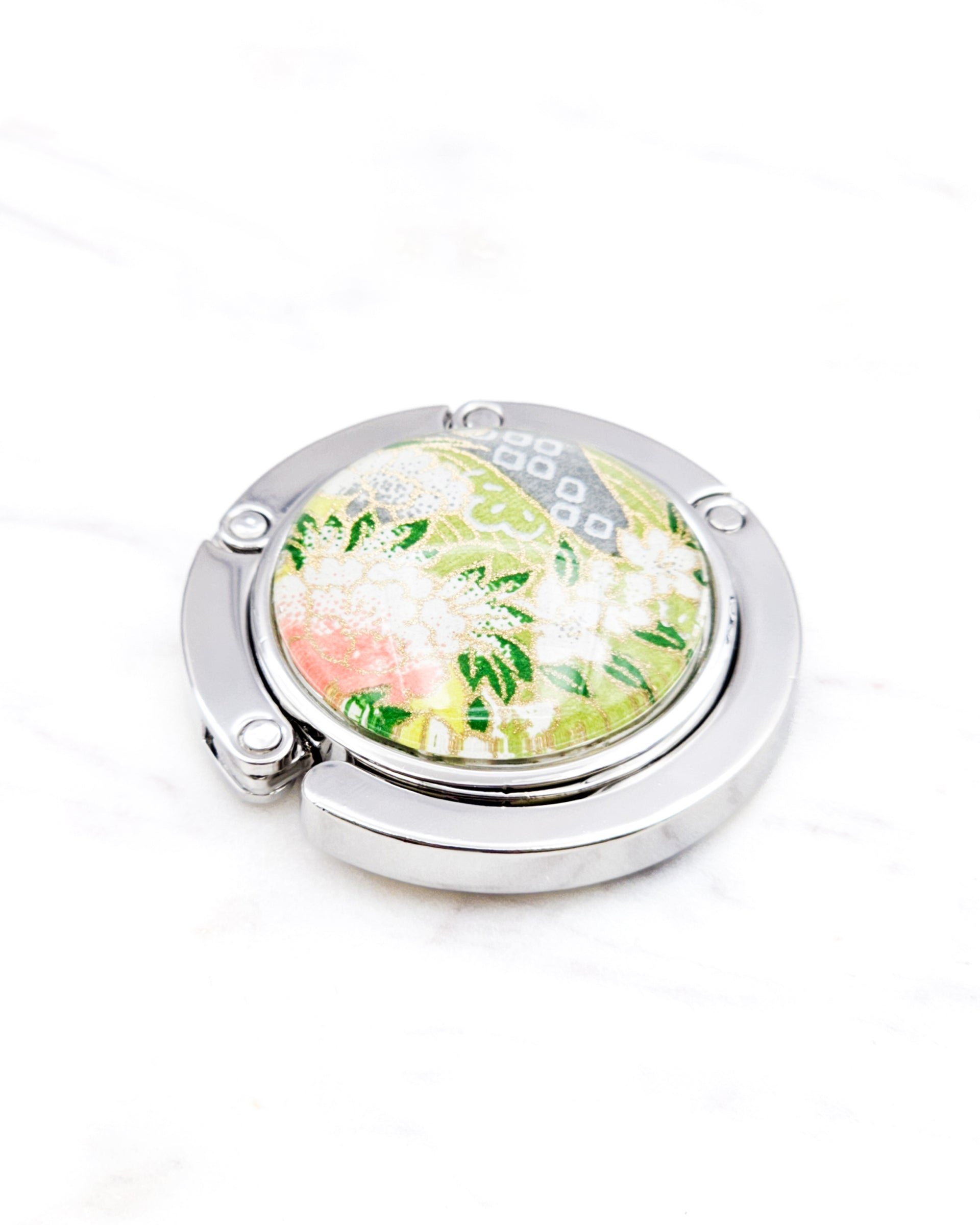 This silver folding tabletop bag hanger is decorated with beautiful authentic Japanese yuzen (chiyogami) paper. The design is protected under a glass dome. The hook folds up and is kept closed with a small magnet on the side. This compact design is perfect for small pockets in bags or purses. The bottom is covered with an anti-slip rubber pad to protect the table.