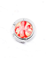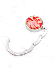 This silver folding tabletop bag hanger is decorated with beautiful authentic Japanese yuzen (chiyogami) paper. The design is protected under a glass dome. The hook folds up and is kept closed with a small magnet on the side. This compact design is perfect for small pockets in bags or purses. The bottom is covered with an anti-slip rubber pad to protect the table.