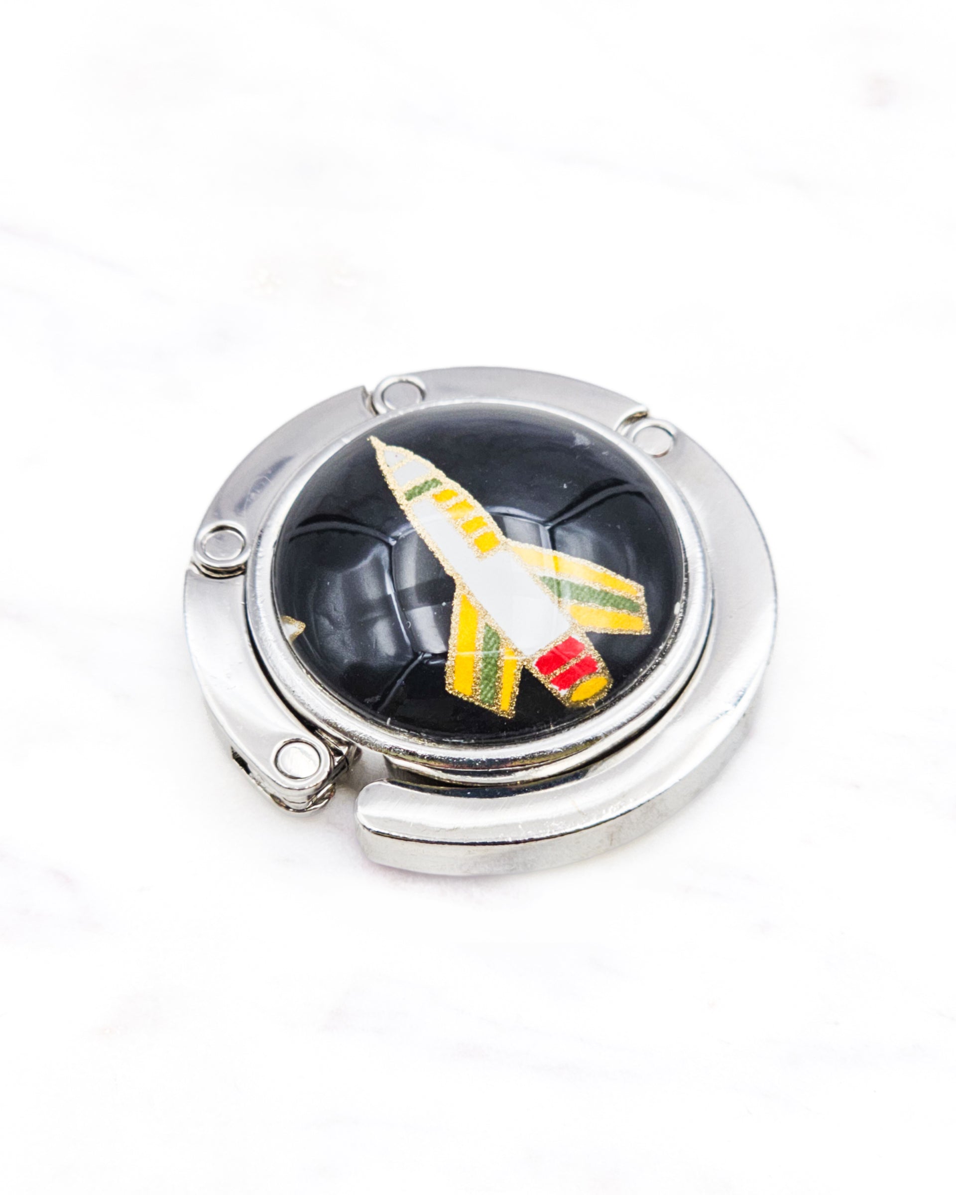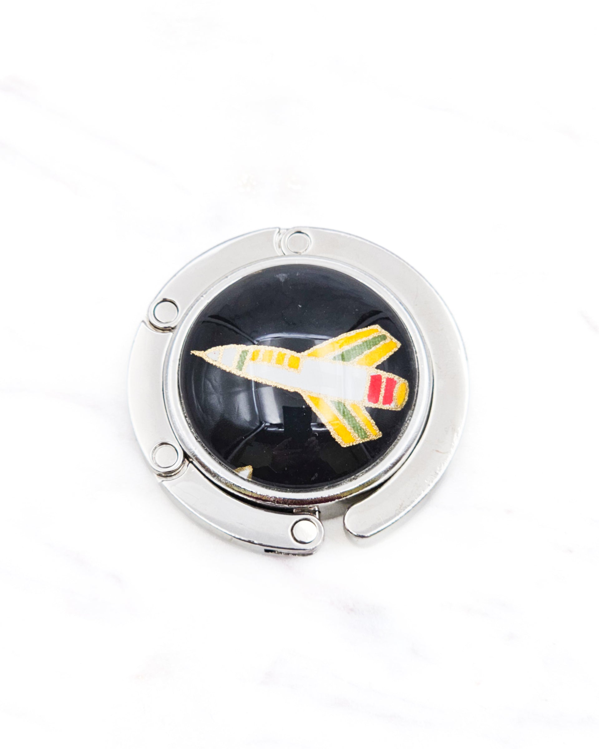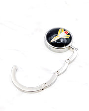 This silver folding tabletop bag hanger is decorated with beautiful authentic Japanese yuzen (chiyogami) paper. The design is protected under a glass dome. The hook folds up and is kept closed with a small magnet on the side. This compact design is perfect for small pockets in bags or purses. The bottom is covered with an anti-slip rubber pad to protect the table.