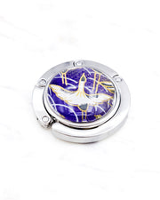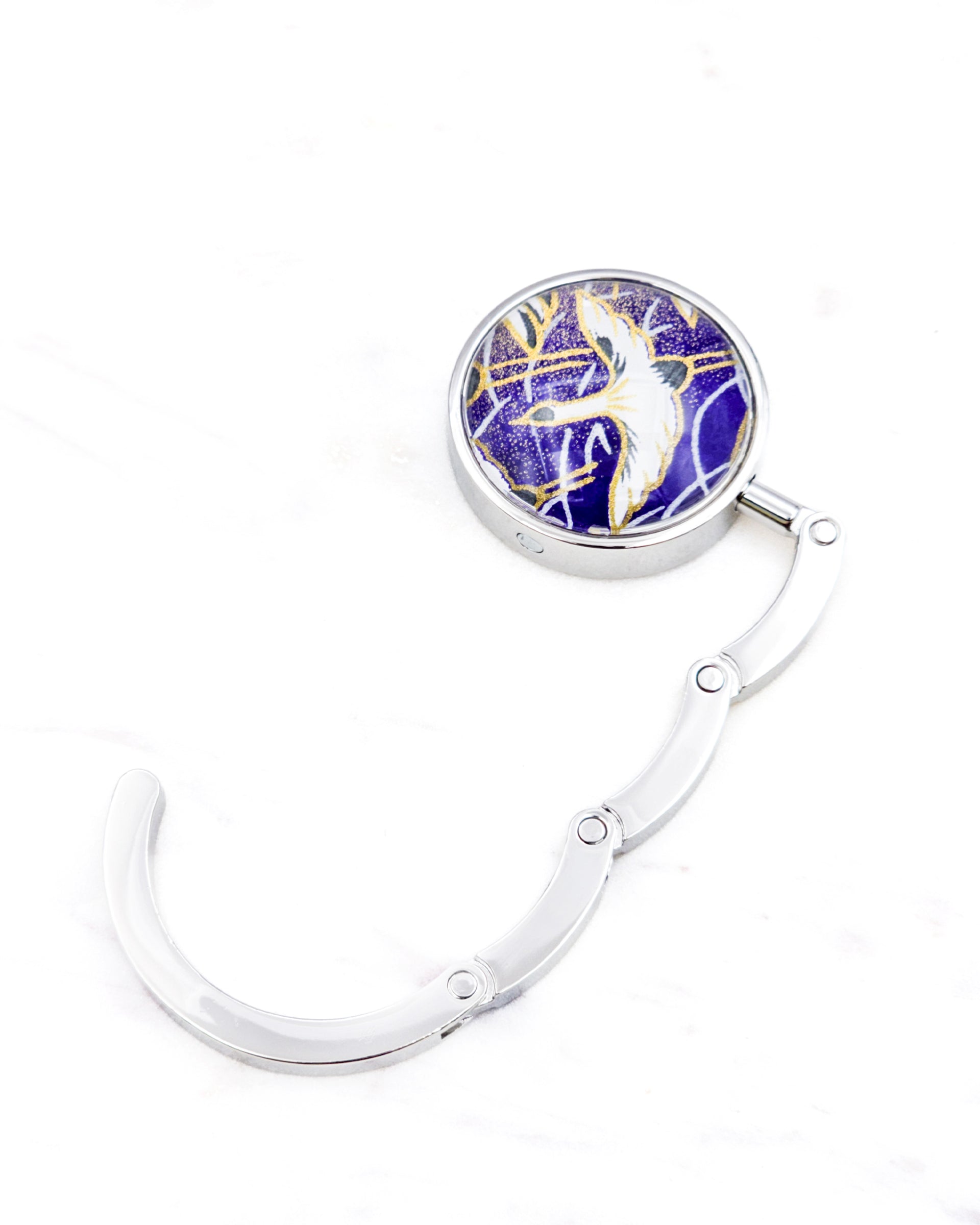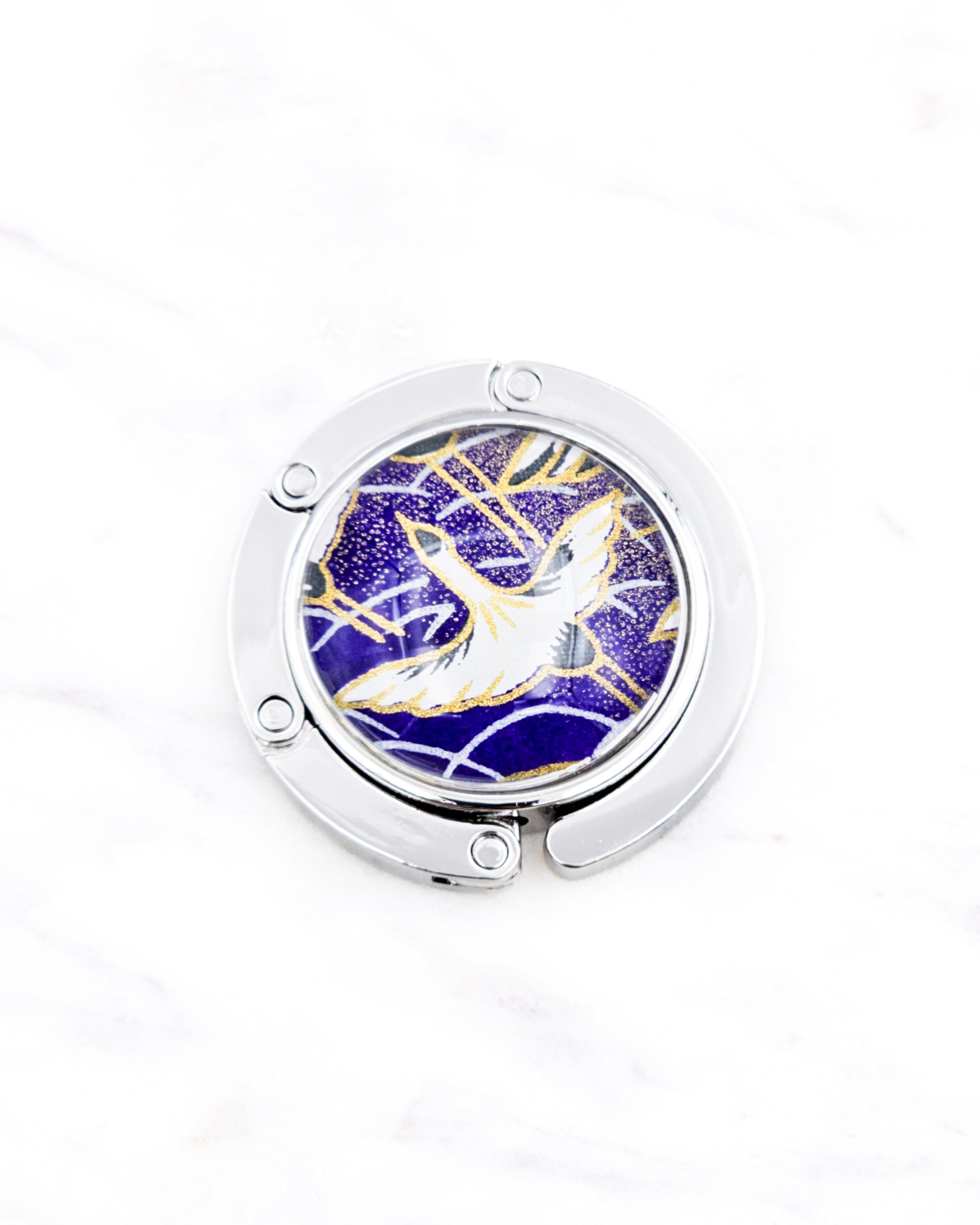 This silver folding tabletop bag hanger is decorated with beautiful authentic Japanese yuzen (chiyogami) paper. The design is protected under a glass dome. The hook folds up and is kept closed with a small magnet on the side. This compact design is perfect for small pockets in bags or purses. The bottom is covered with an anti-slip rubber pad to protect the table.