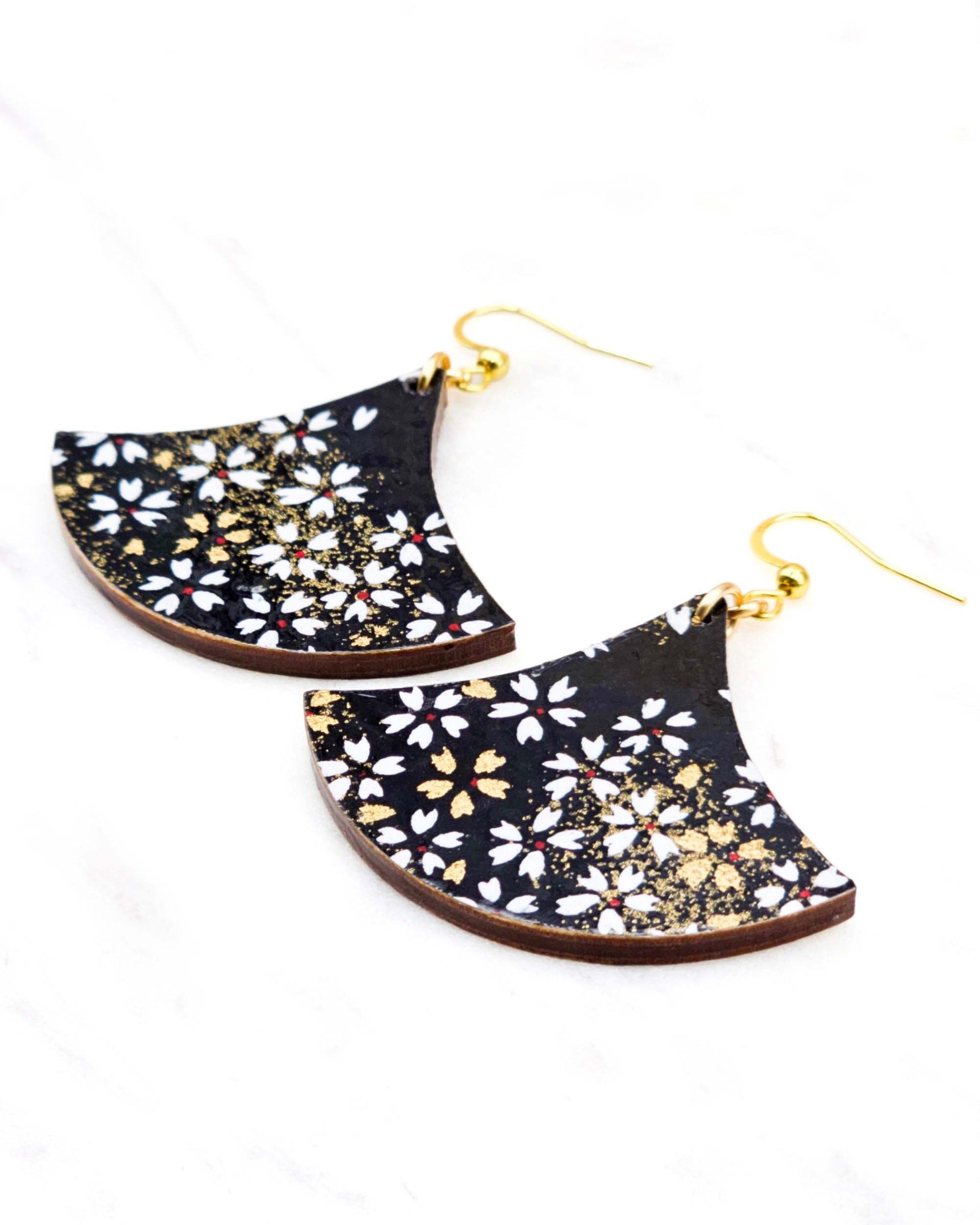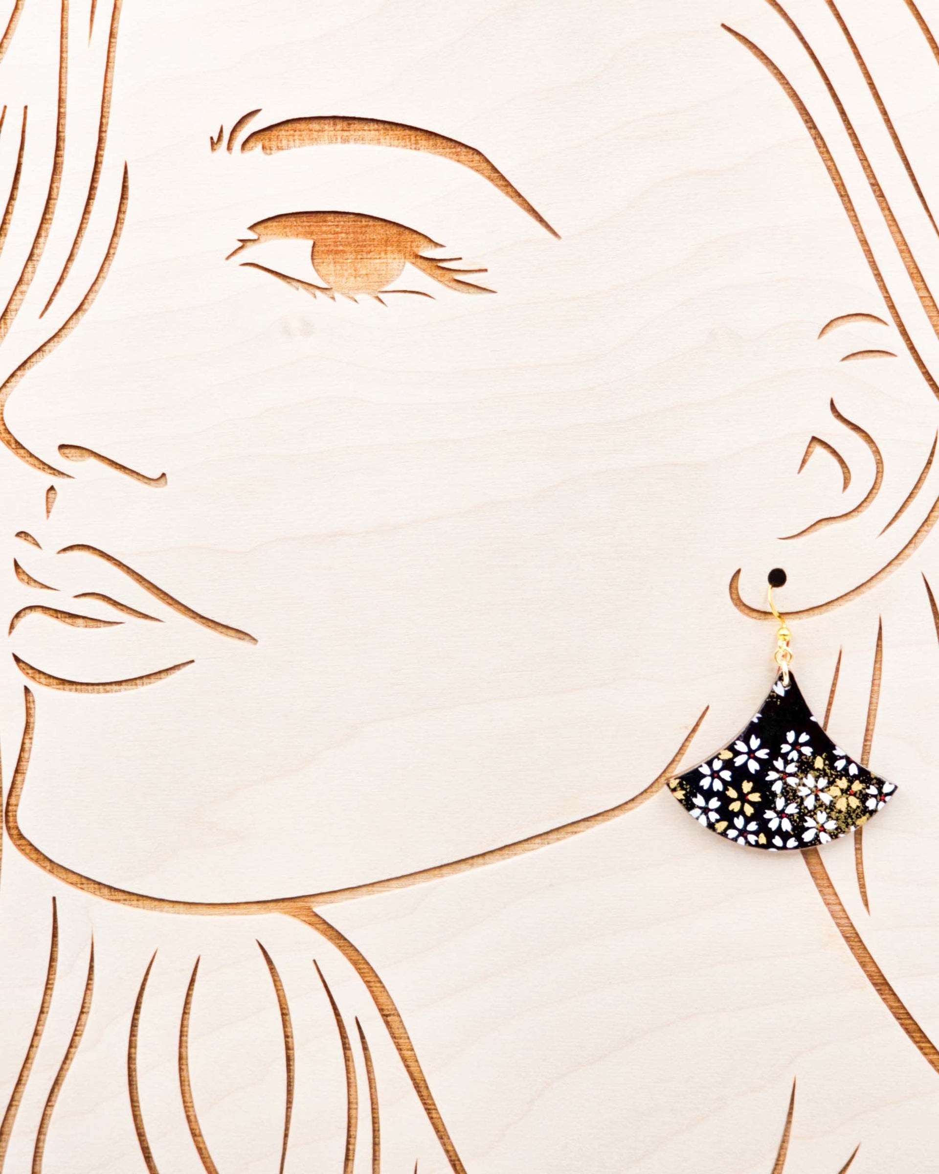 These earrings are made out of birch wood and decorated with Japanese chiyogami paper. They're extremely light weight and are double-sided just in case you have short hair or have your hair up.