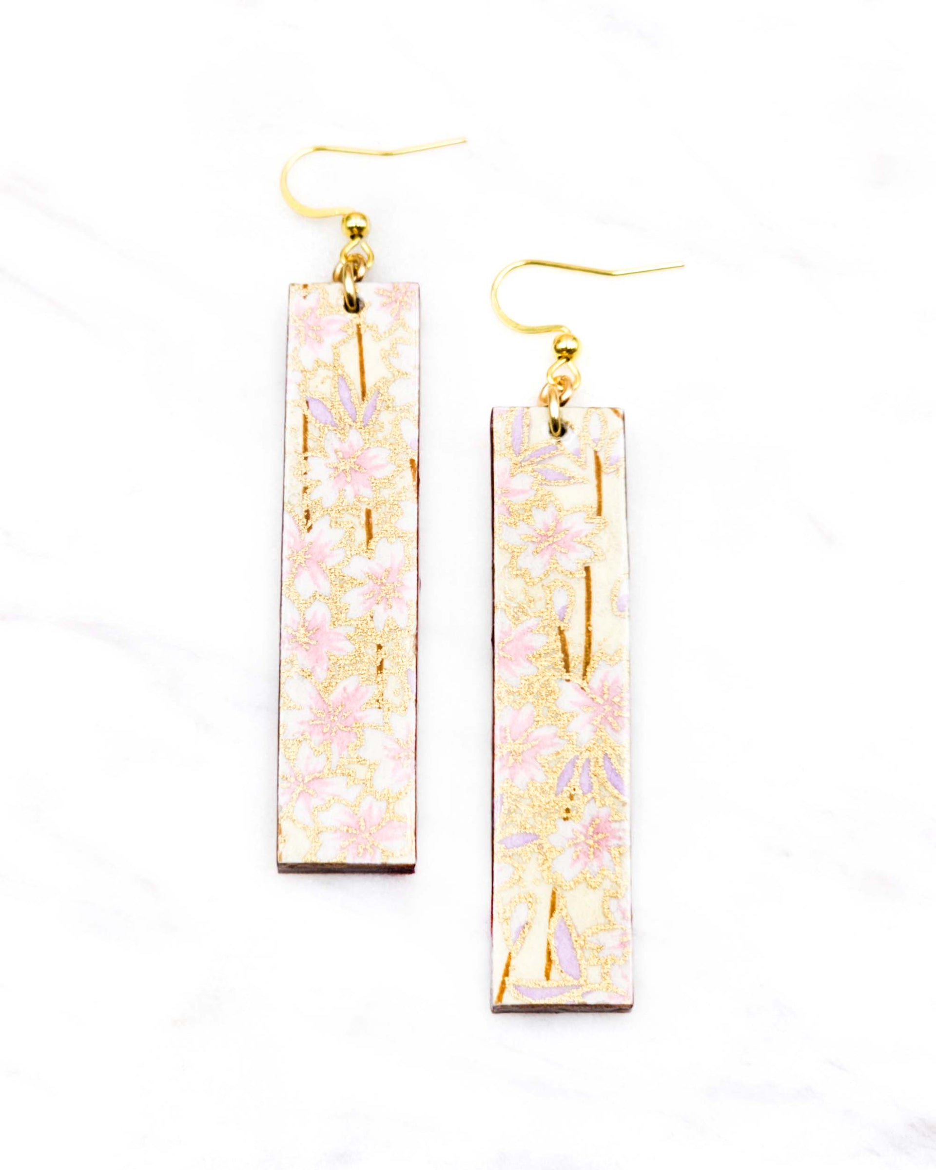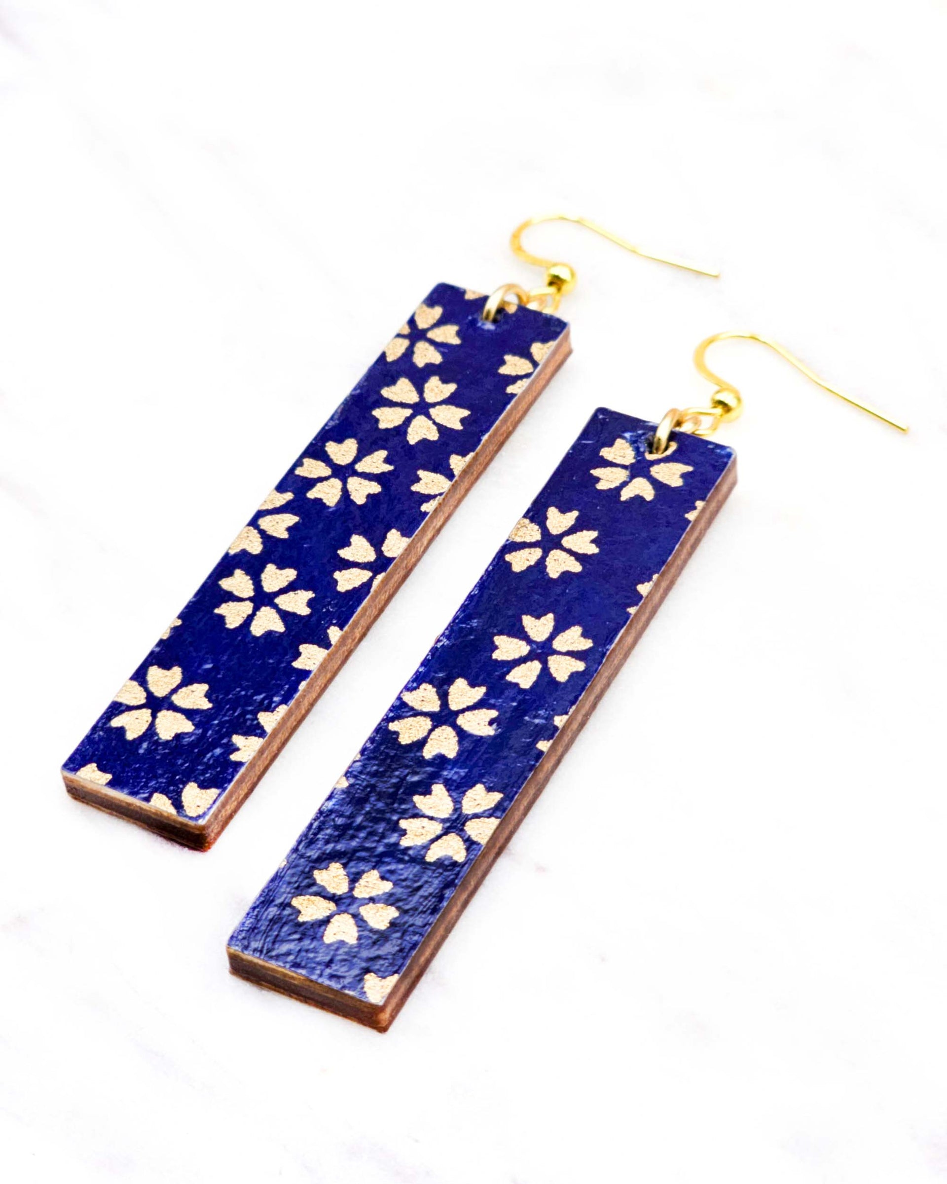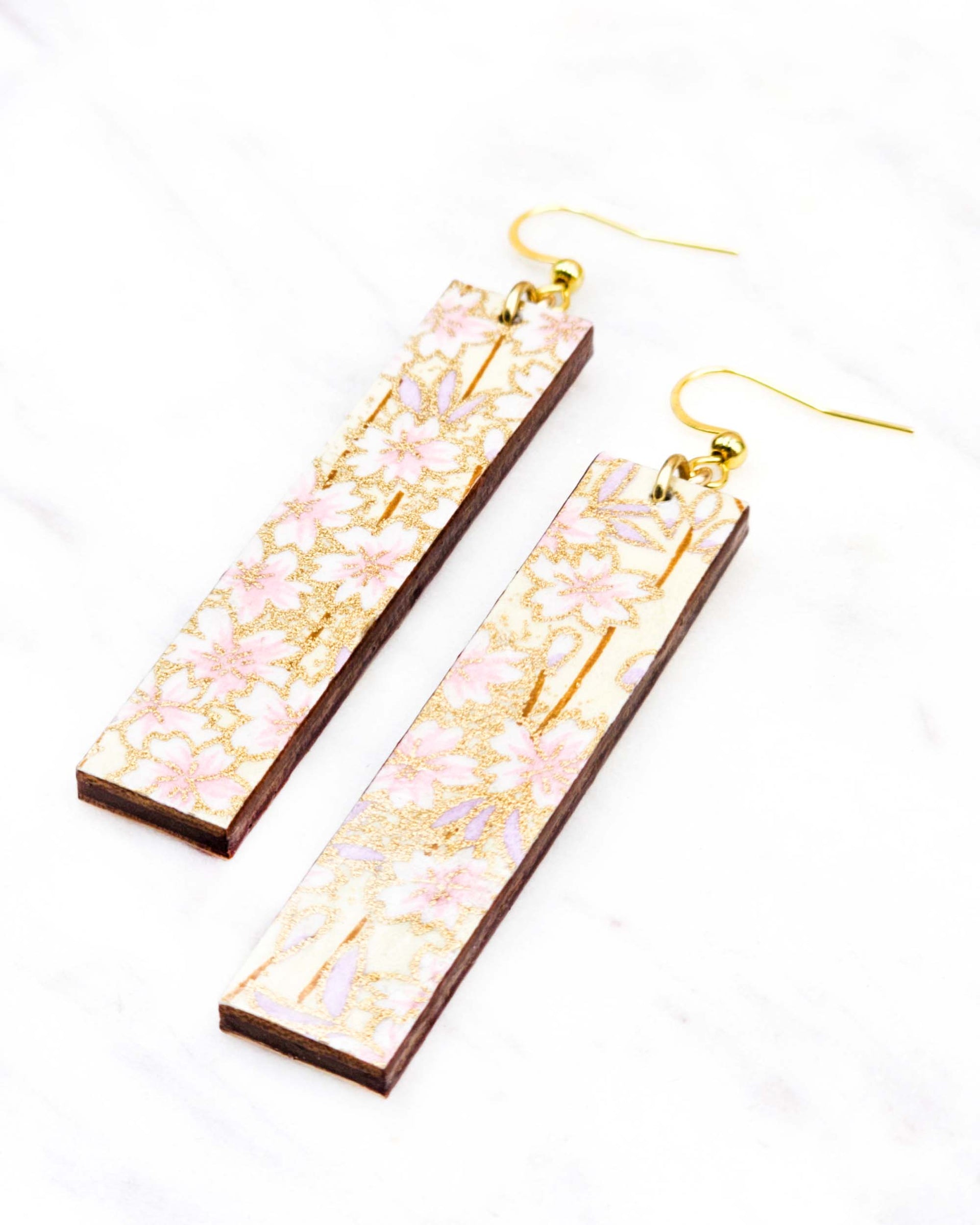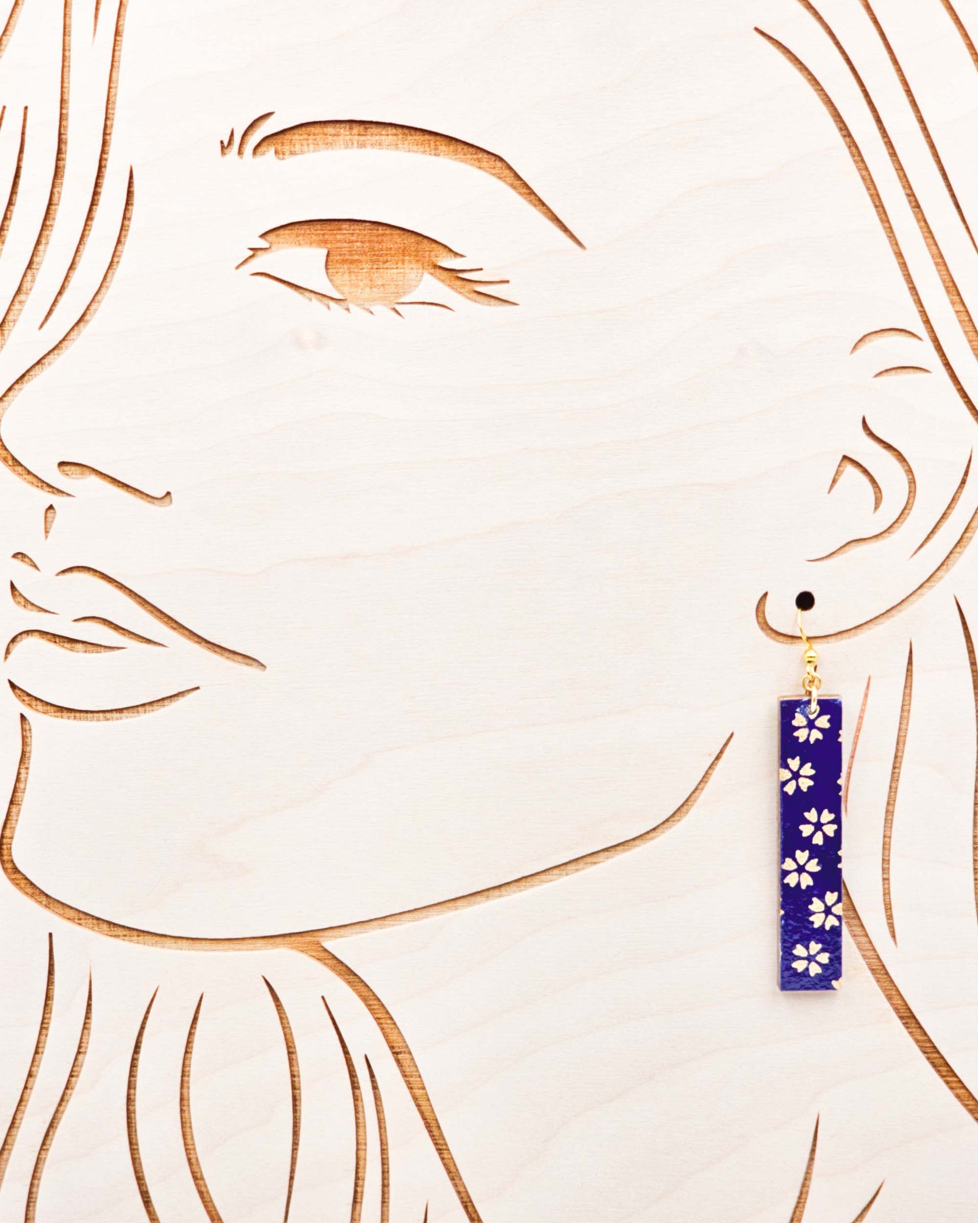 These earrings are made out of birch wood and decorated with Japanese chiyogami paper. They're extremely light weight and are double-sided just in case you have short hair or have your hair up.