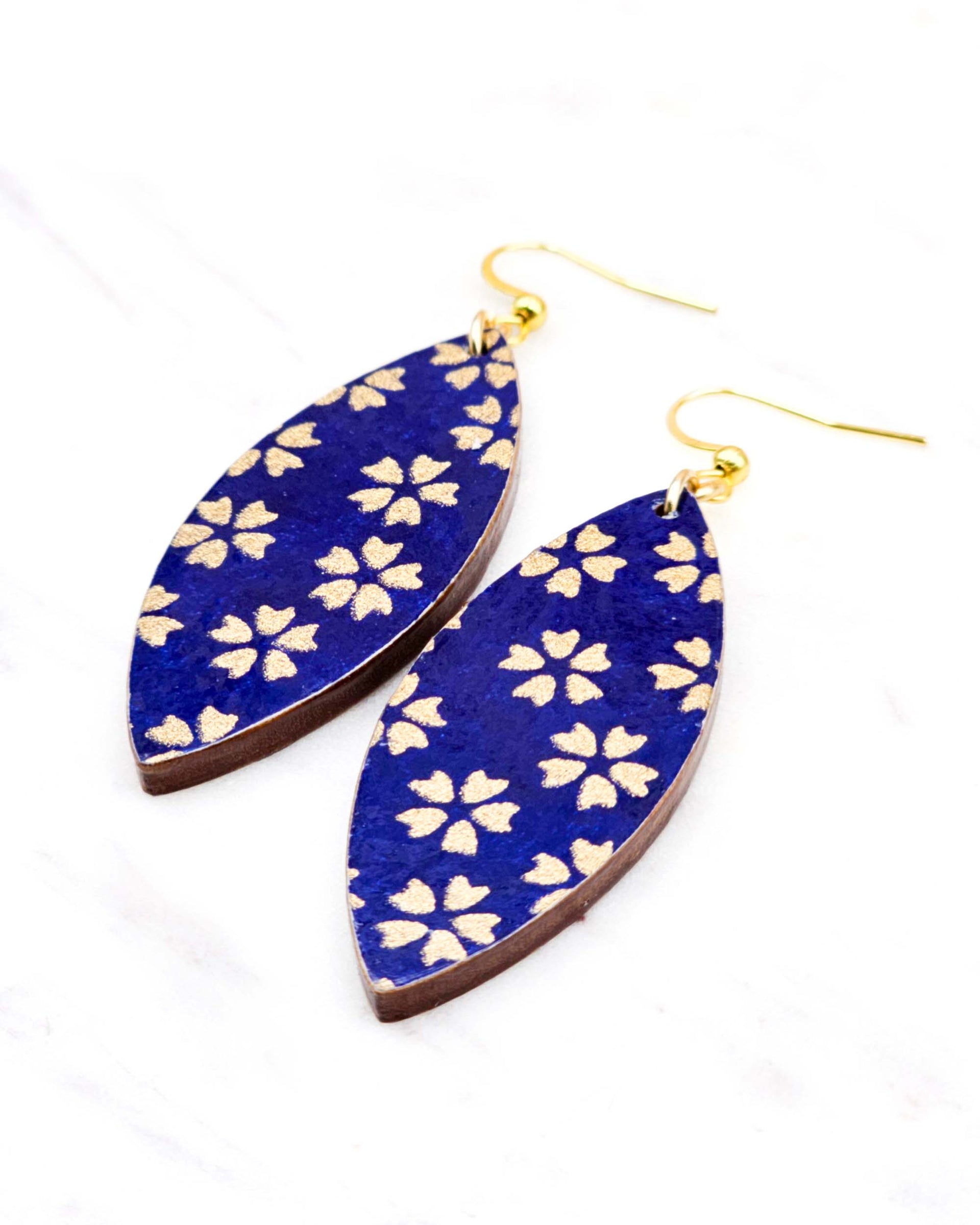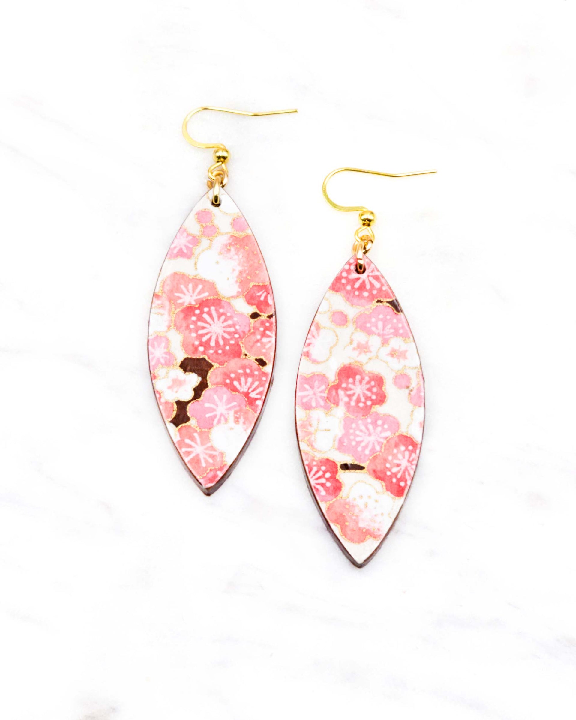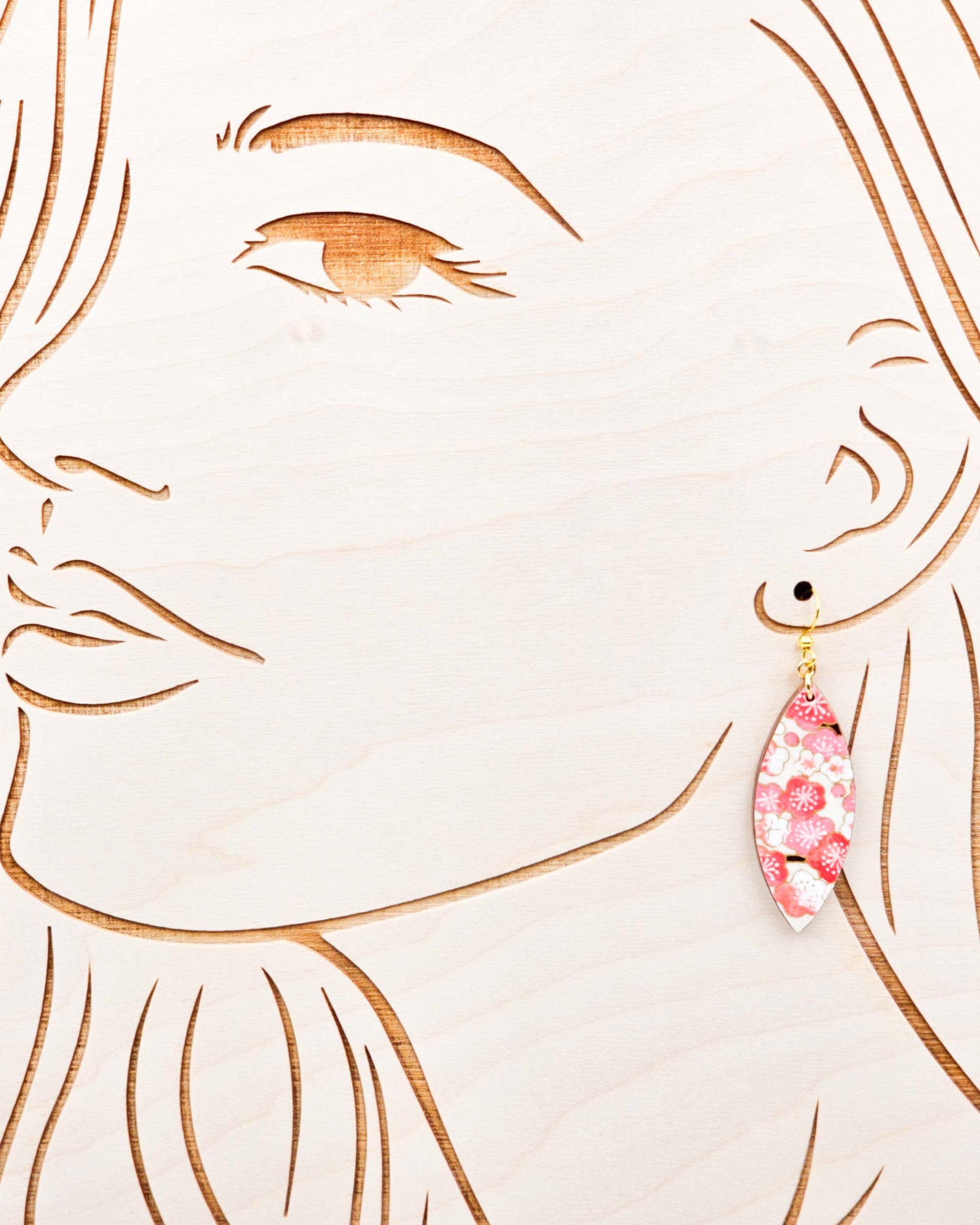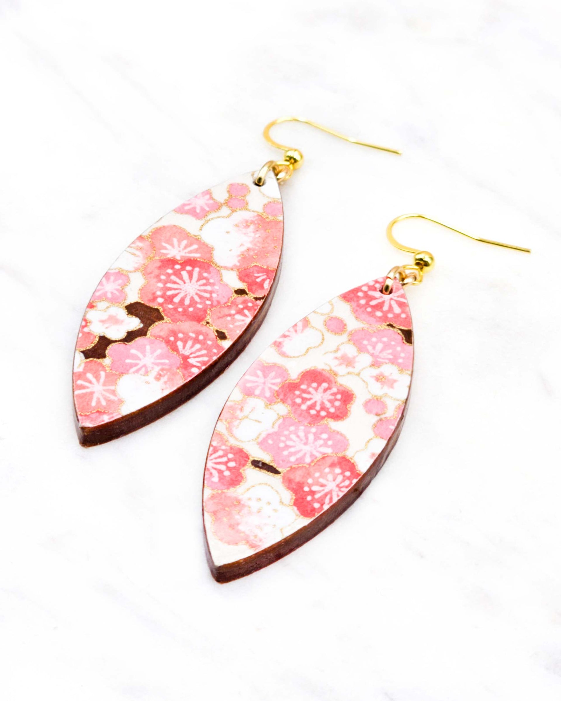 These earrings are made out of birch wood and decorated with Japanese chiyogami paper. They're extremely light weight and are double-sided just in case you have short hair or have your hair up.