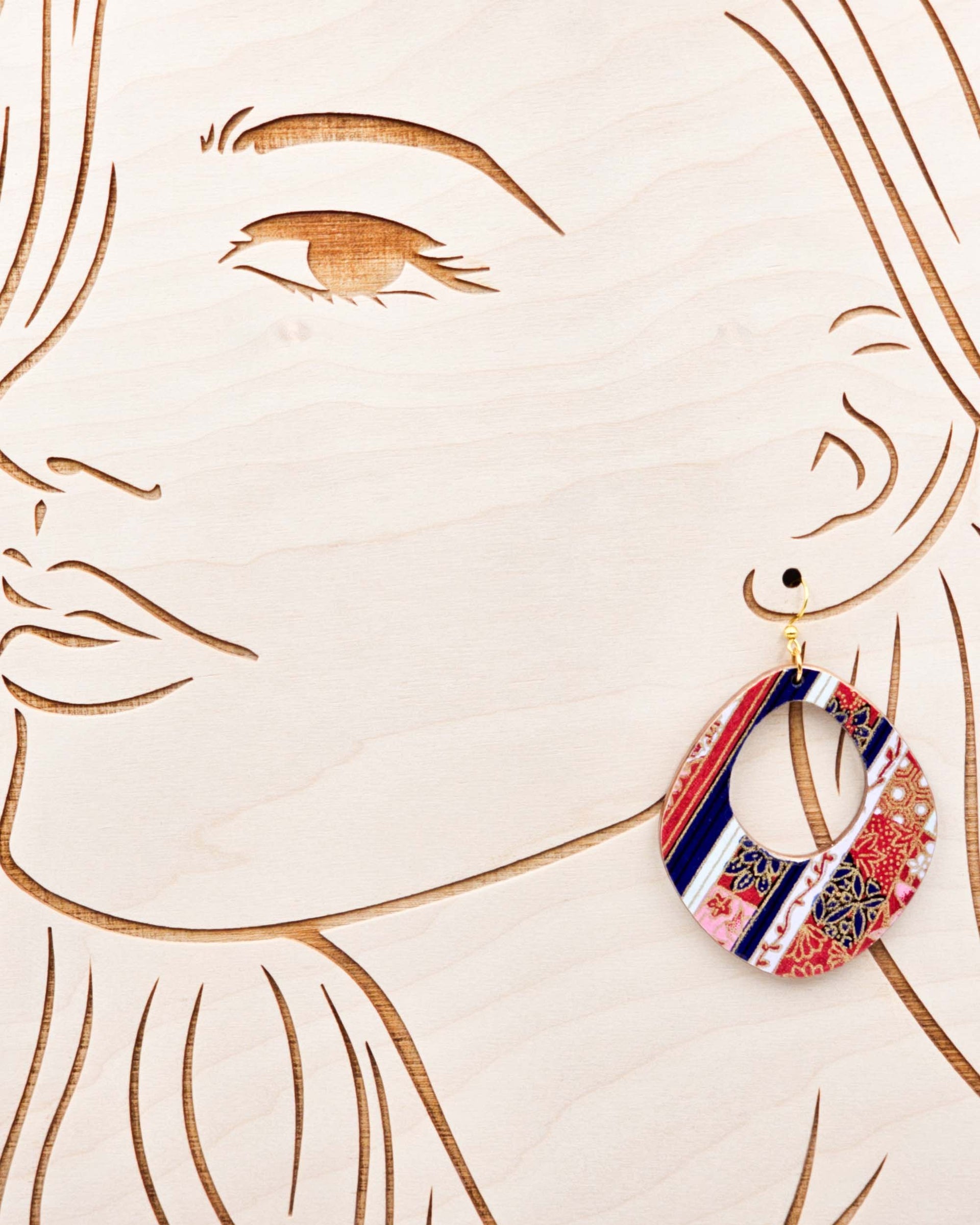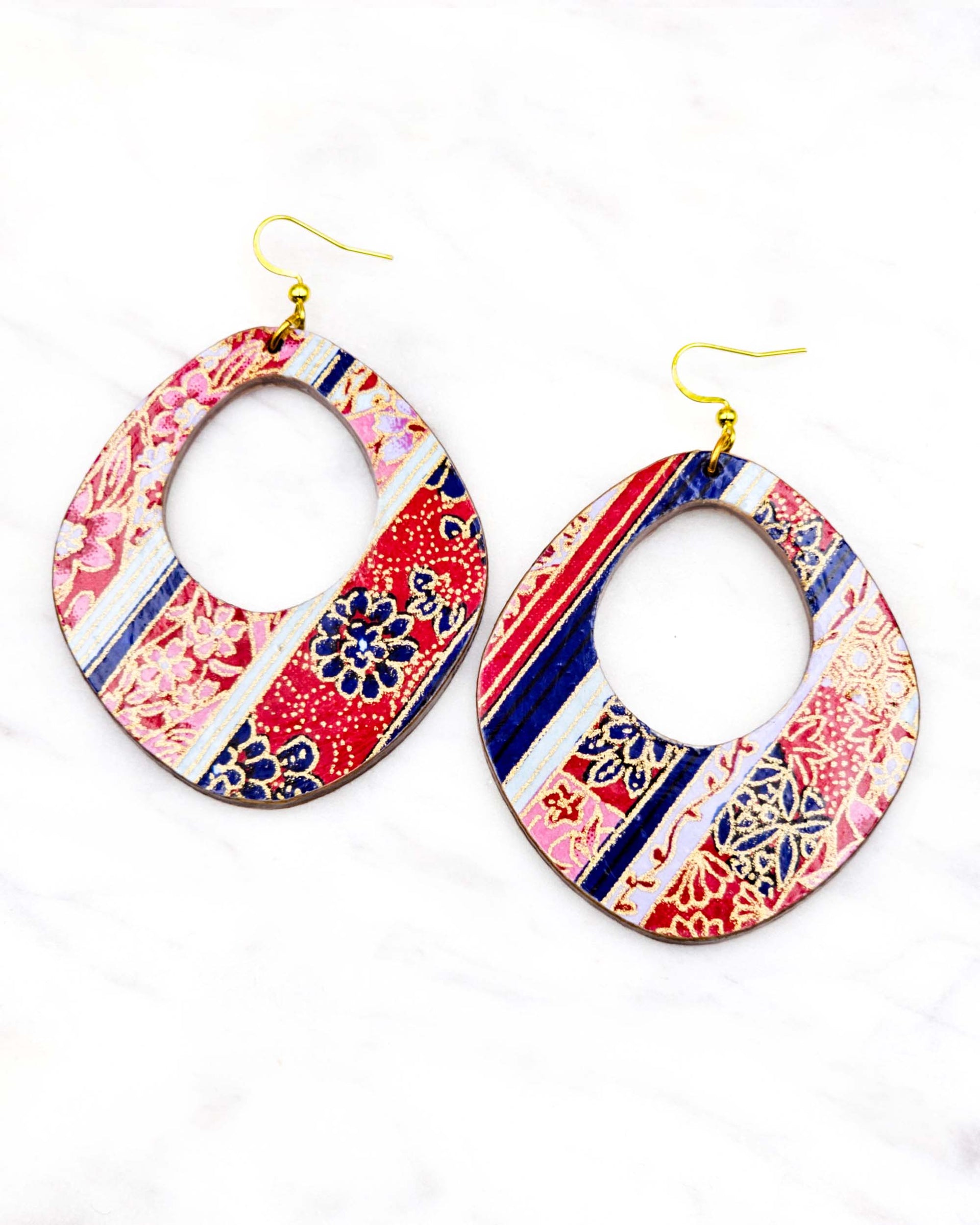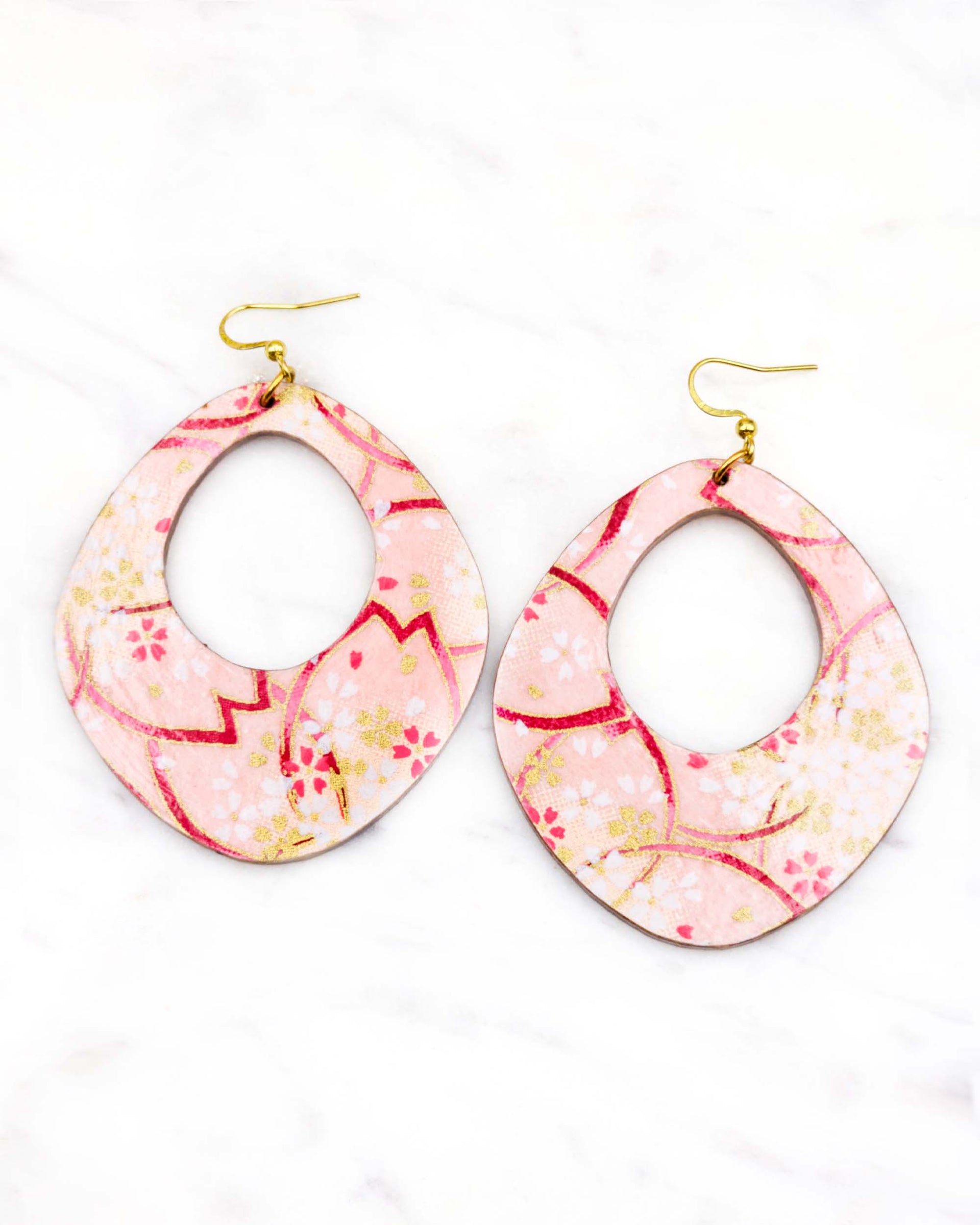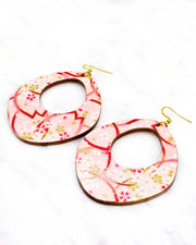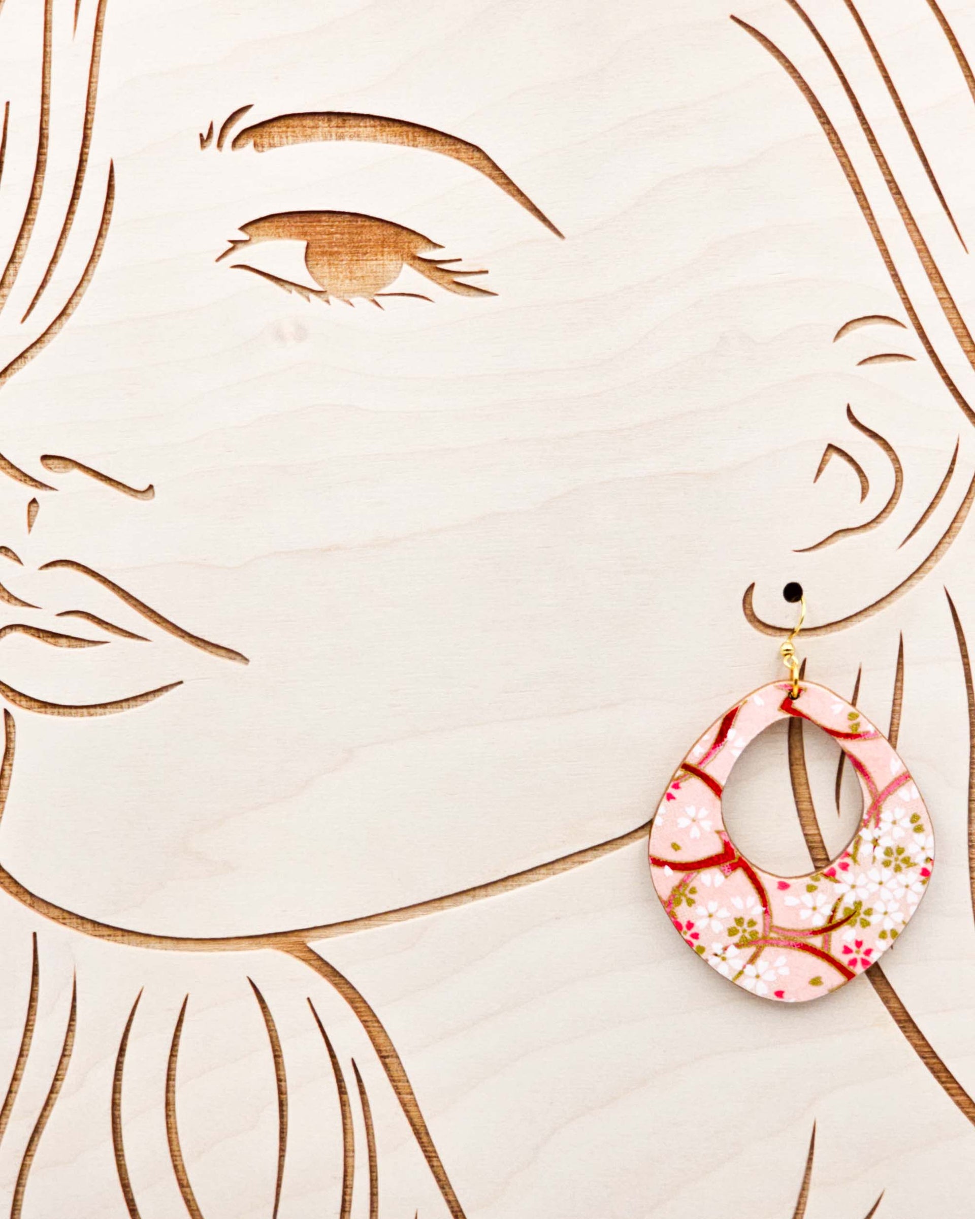 These earrings are made out of birch wood and decorated with Japanese chiyogami paper. They're extremely light weight and are double-sided just in case you have short hair or have your hair up.