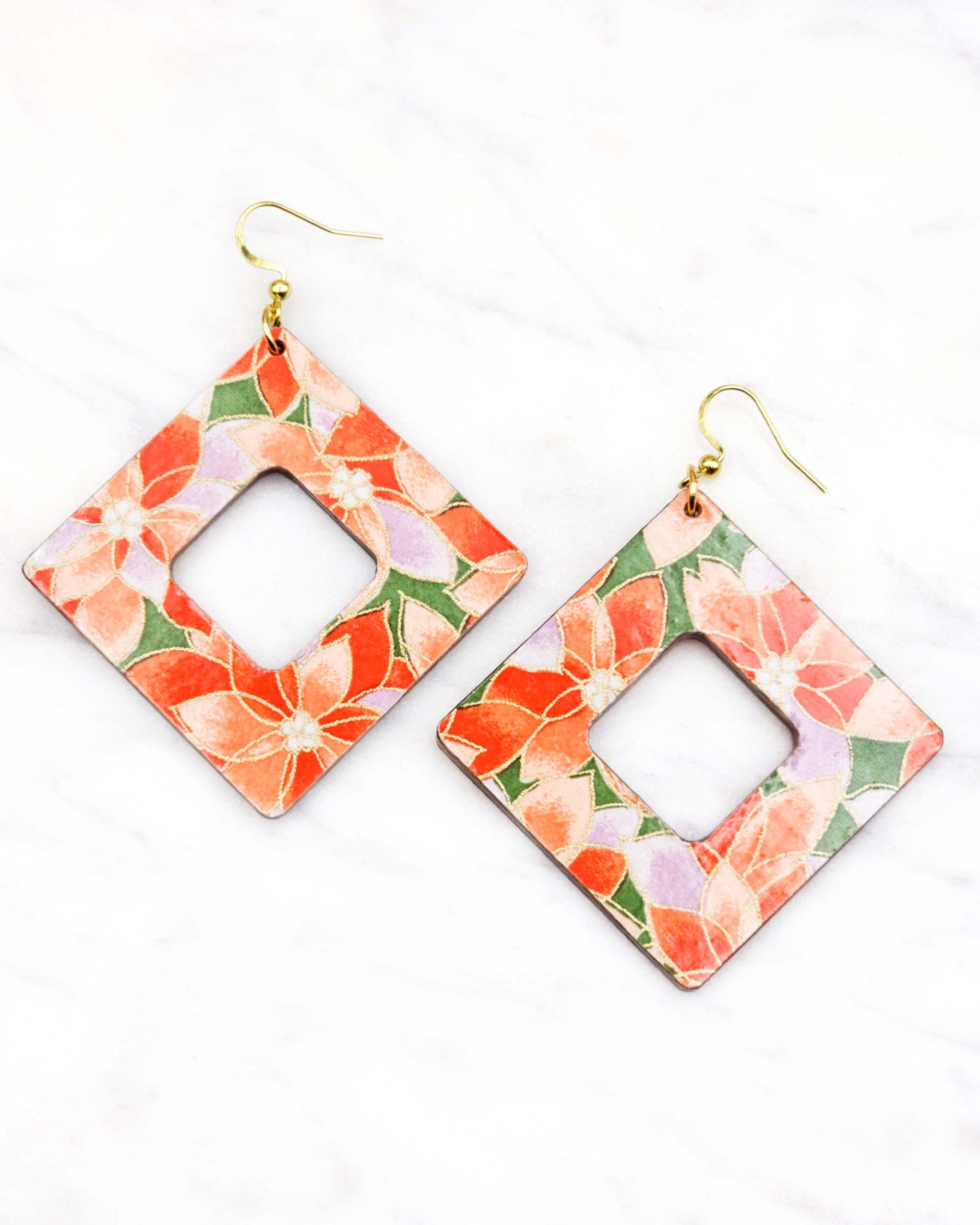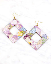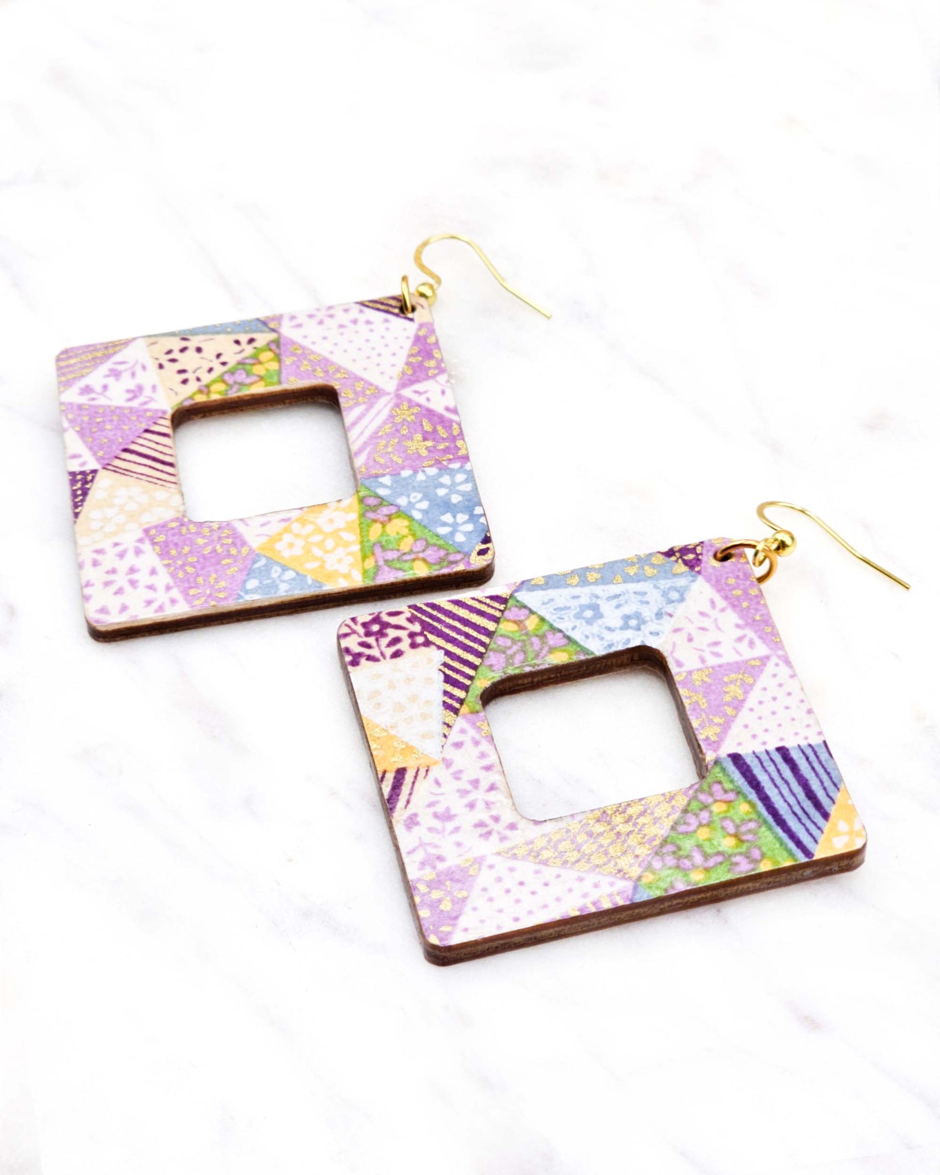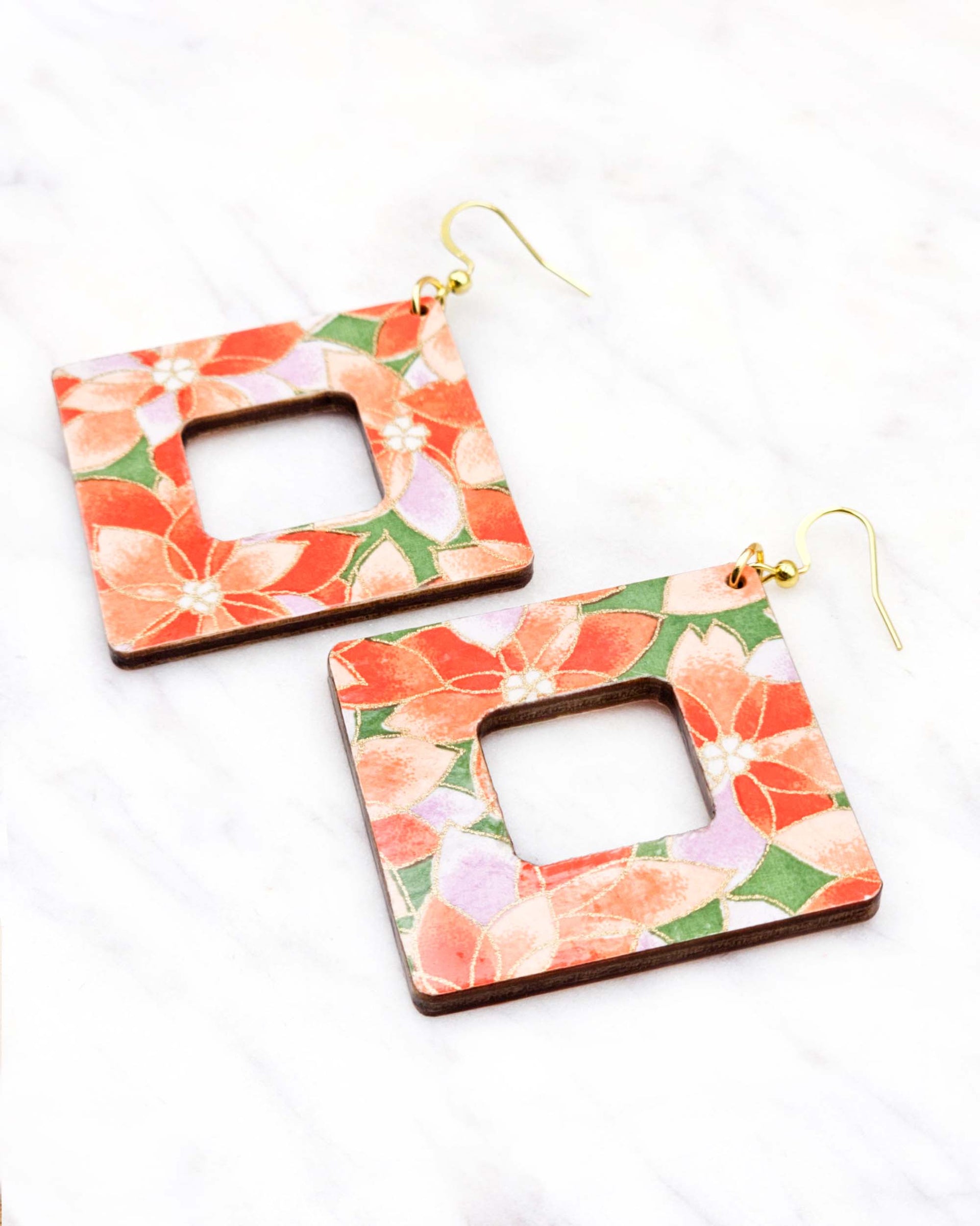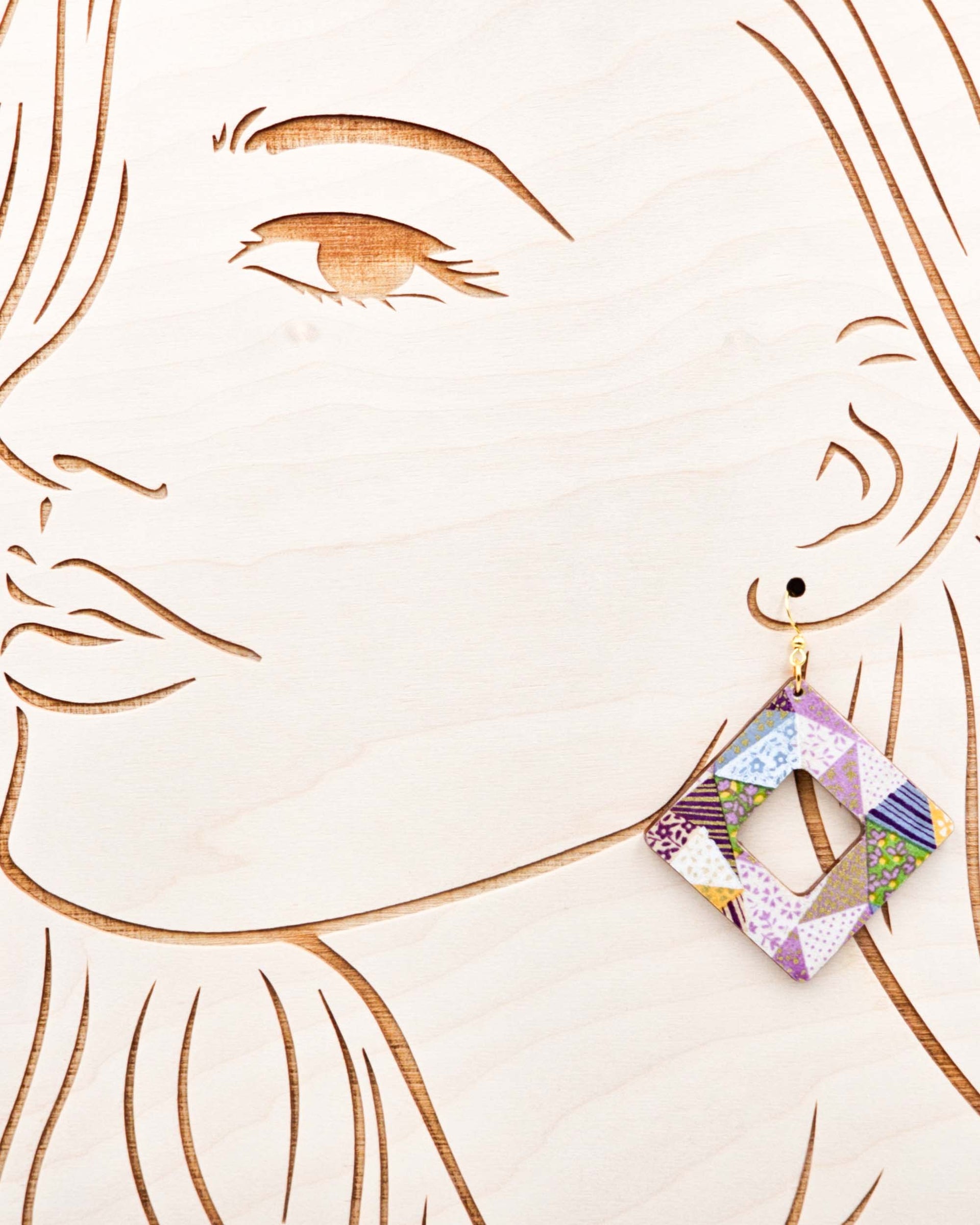 These earrings are made out of birch wood and decorated with Japanese chiyogami paper. They're extremely light weight and are double-sided just in case you have short hair or have your hair up.