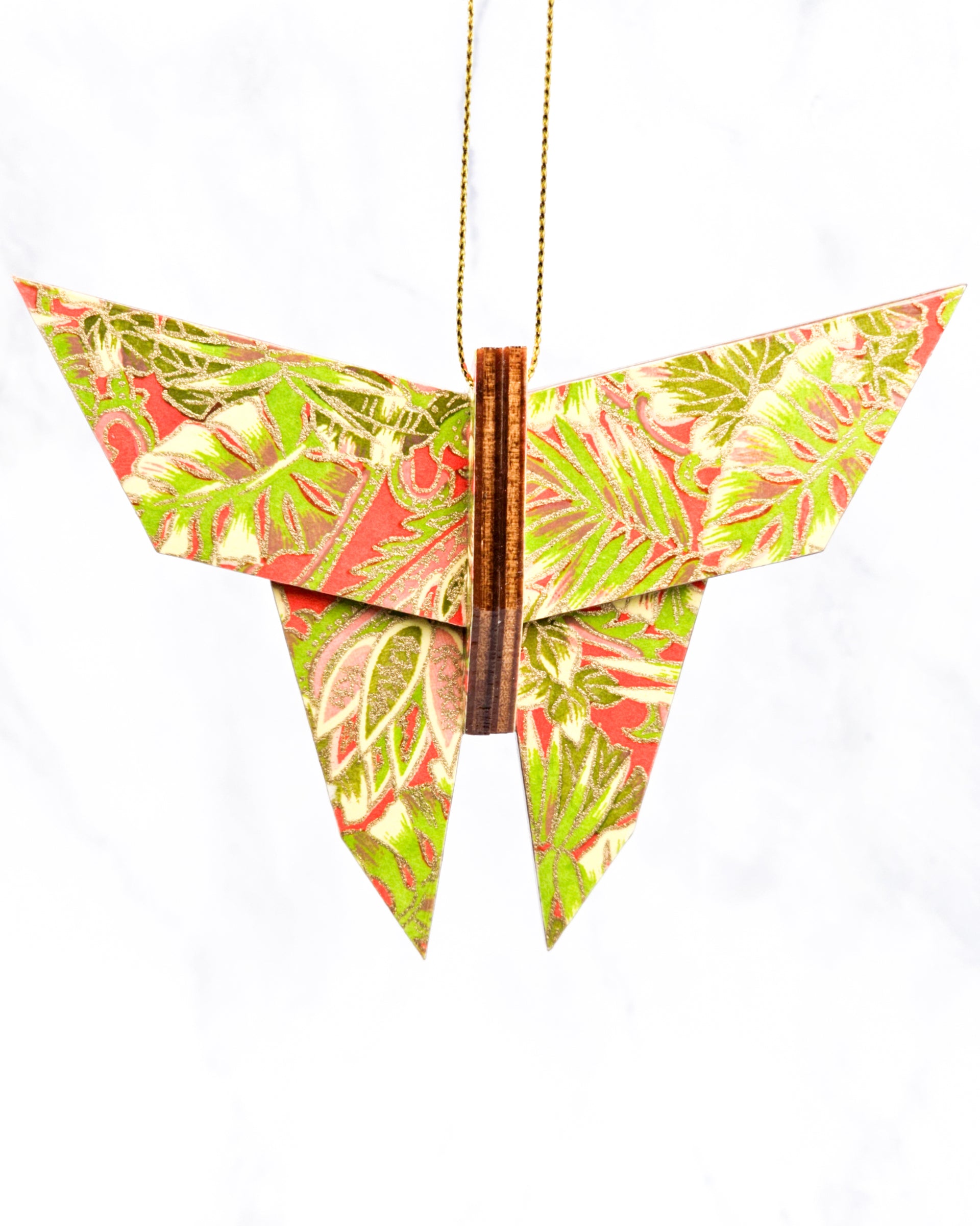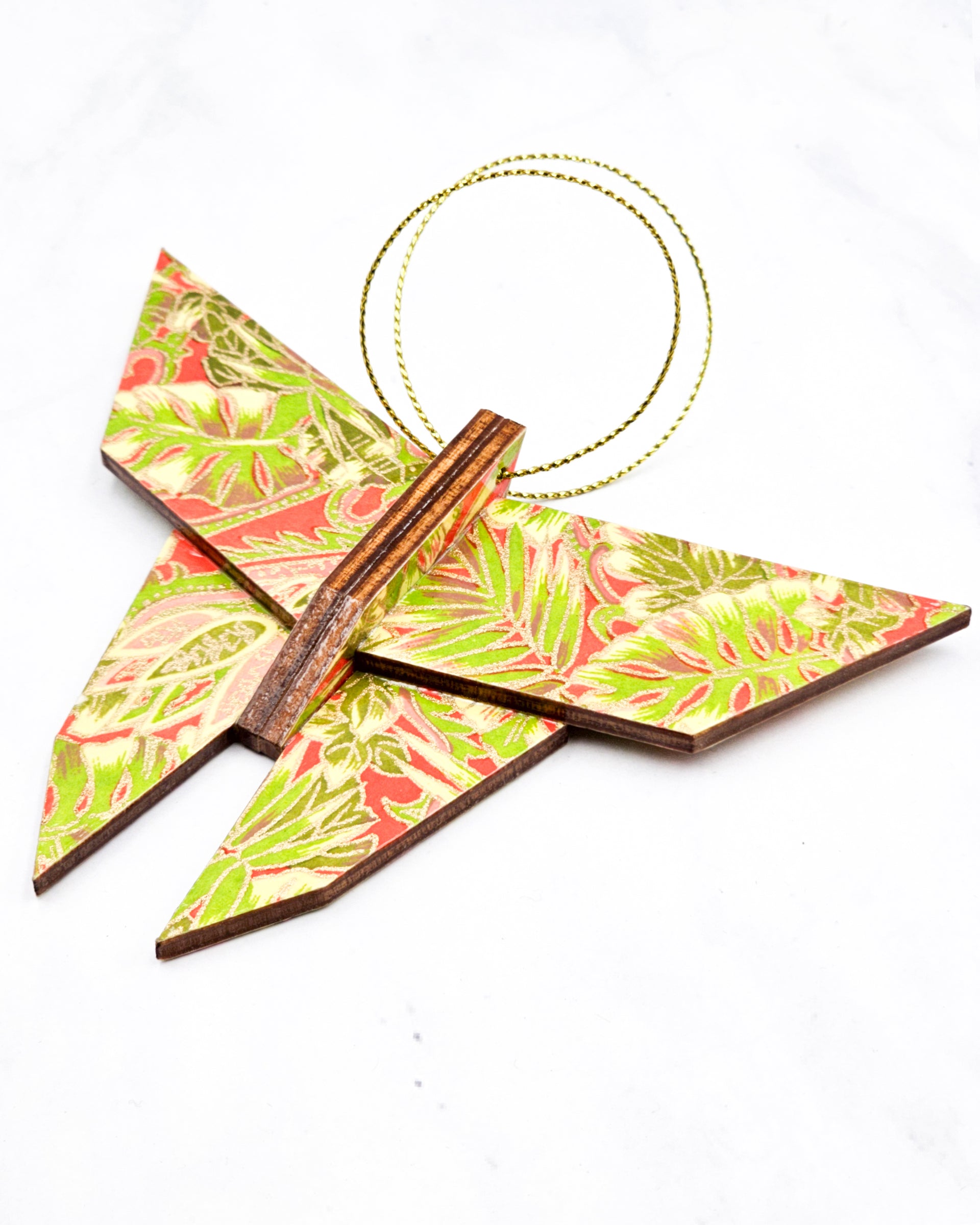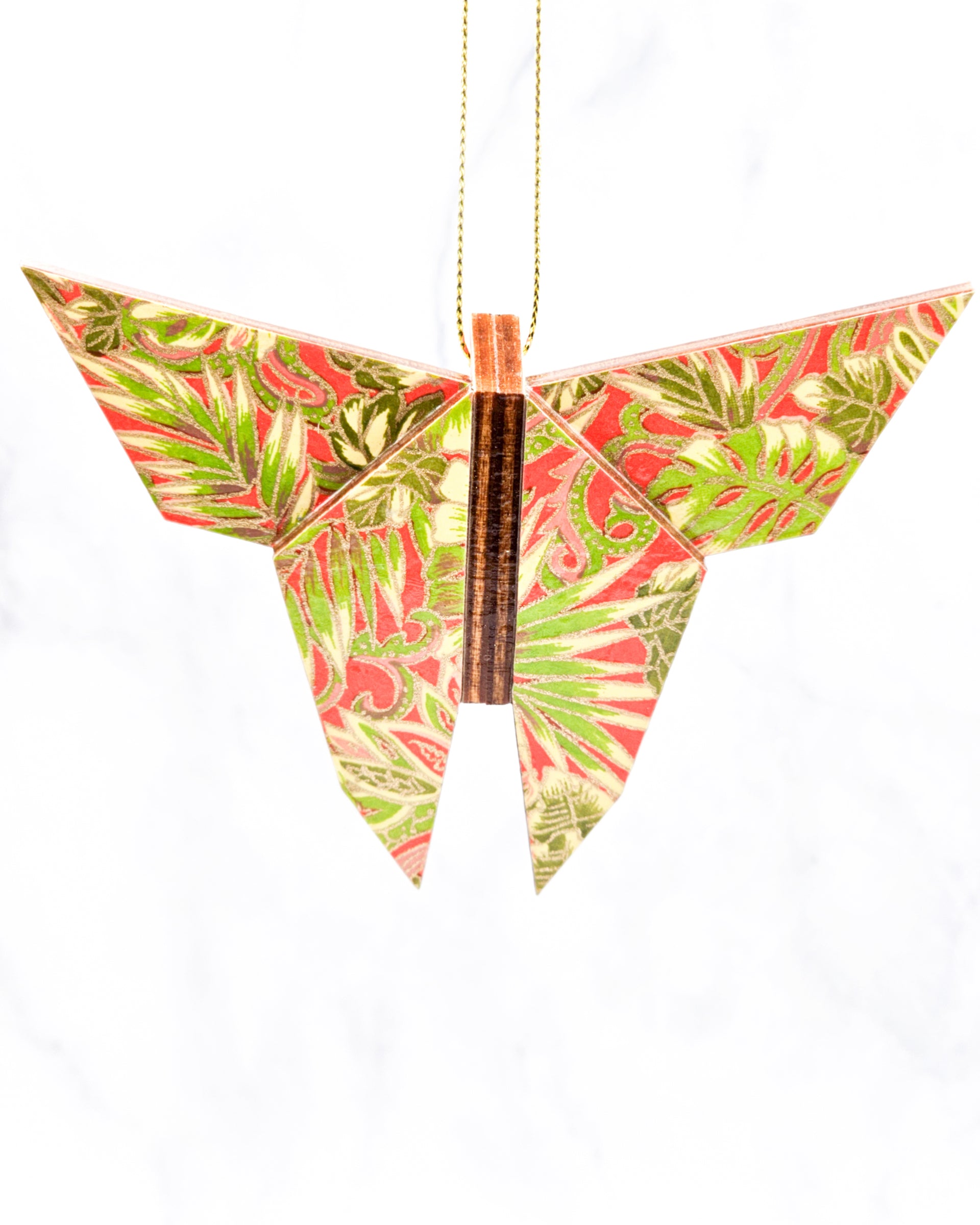 Wooden Origami Butterfly - Green & Pink Fronds on Red