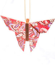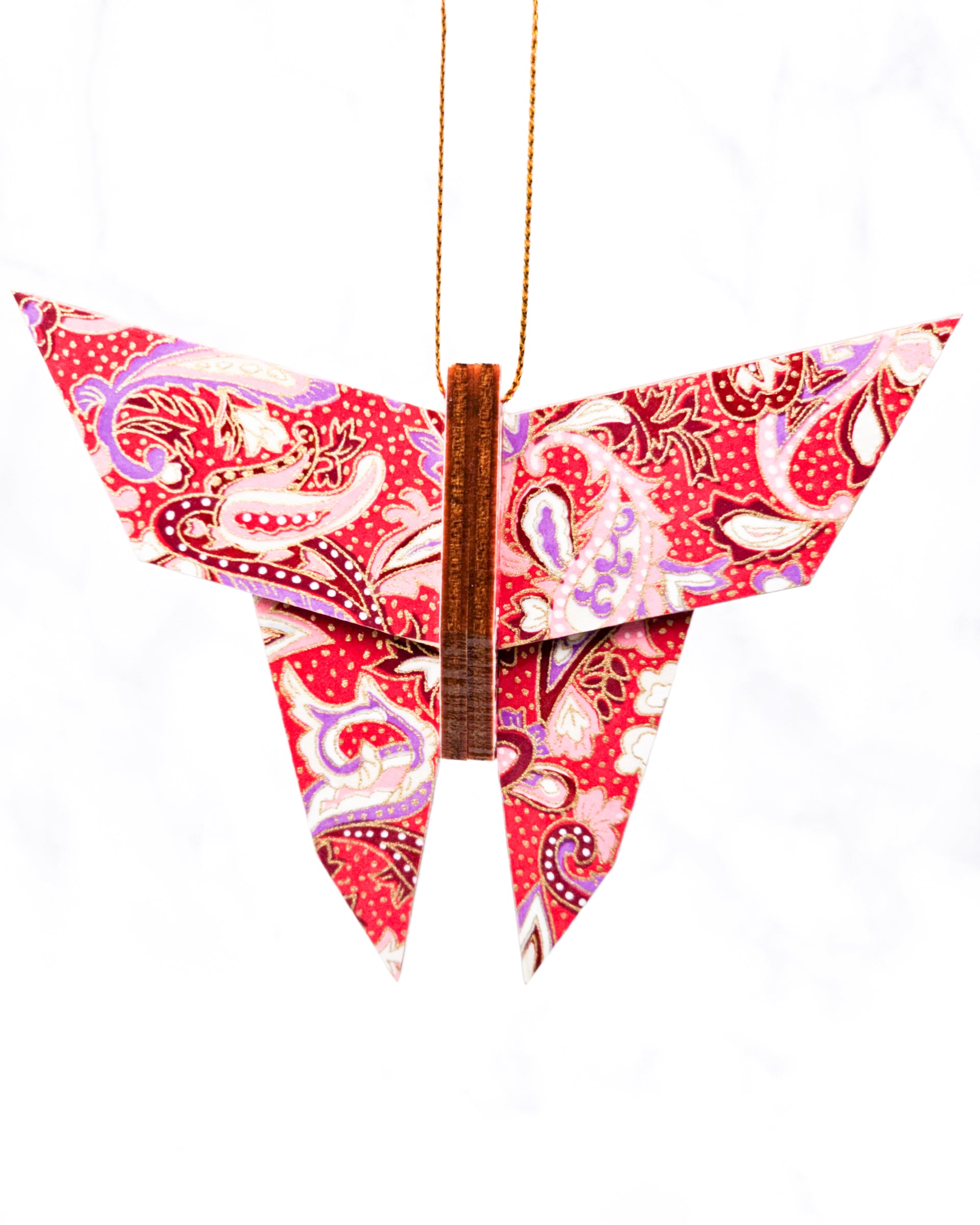 These light-weight origami butterflies are handmade from laser-cut wood and Japanese chiyogami paper. They are meant to be hung as an ornamental display. Both the front and back are covered in the same paper design. They are well sealed by hand for durability. Even though they are water resistant due to the many layers of sealant, please do not soak them in water or display outdoors. Displaying in areas with prolonged direct sun exposure may cause the colors to fade over time. The butterflies are fragile and delicate parts may break if dropped on a hard surface, so please handle with care. These butterflies will last for a long time with proper care.