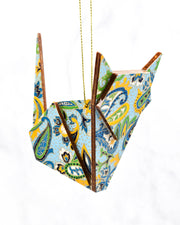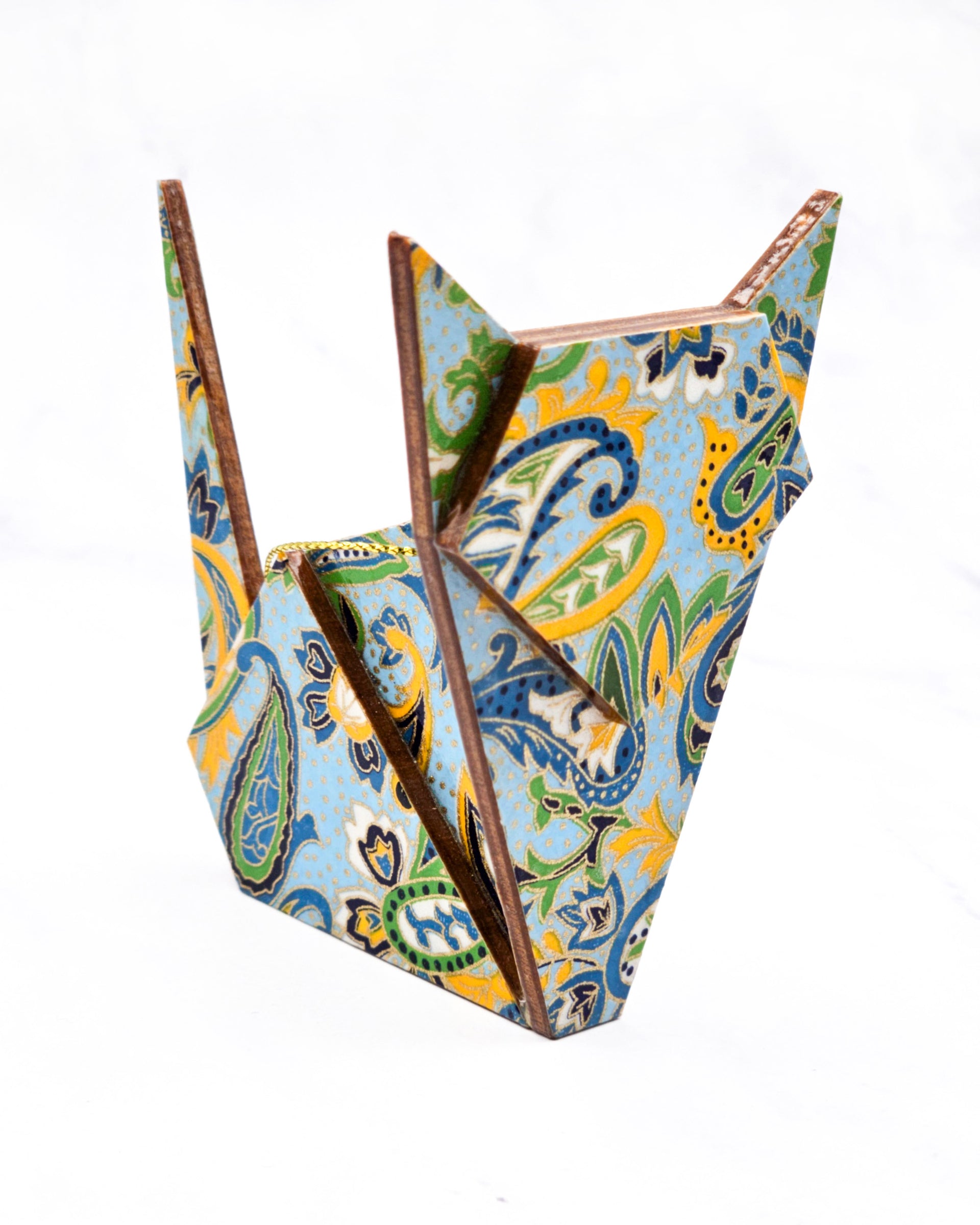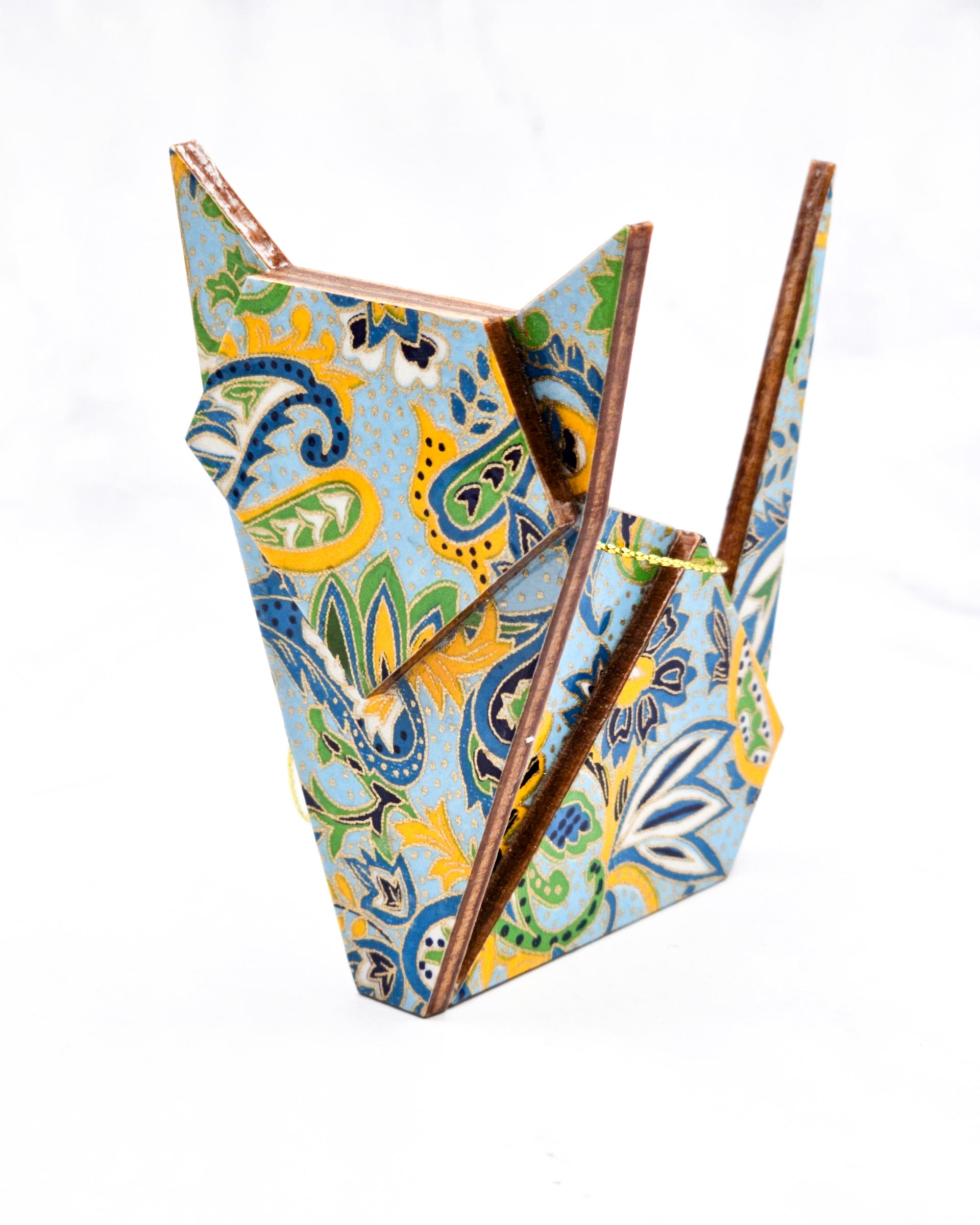 Wooden Origami Cat - Green & Yellow Paisley on Light Blue