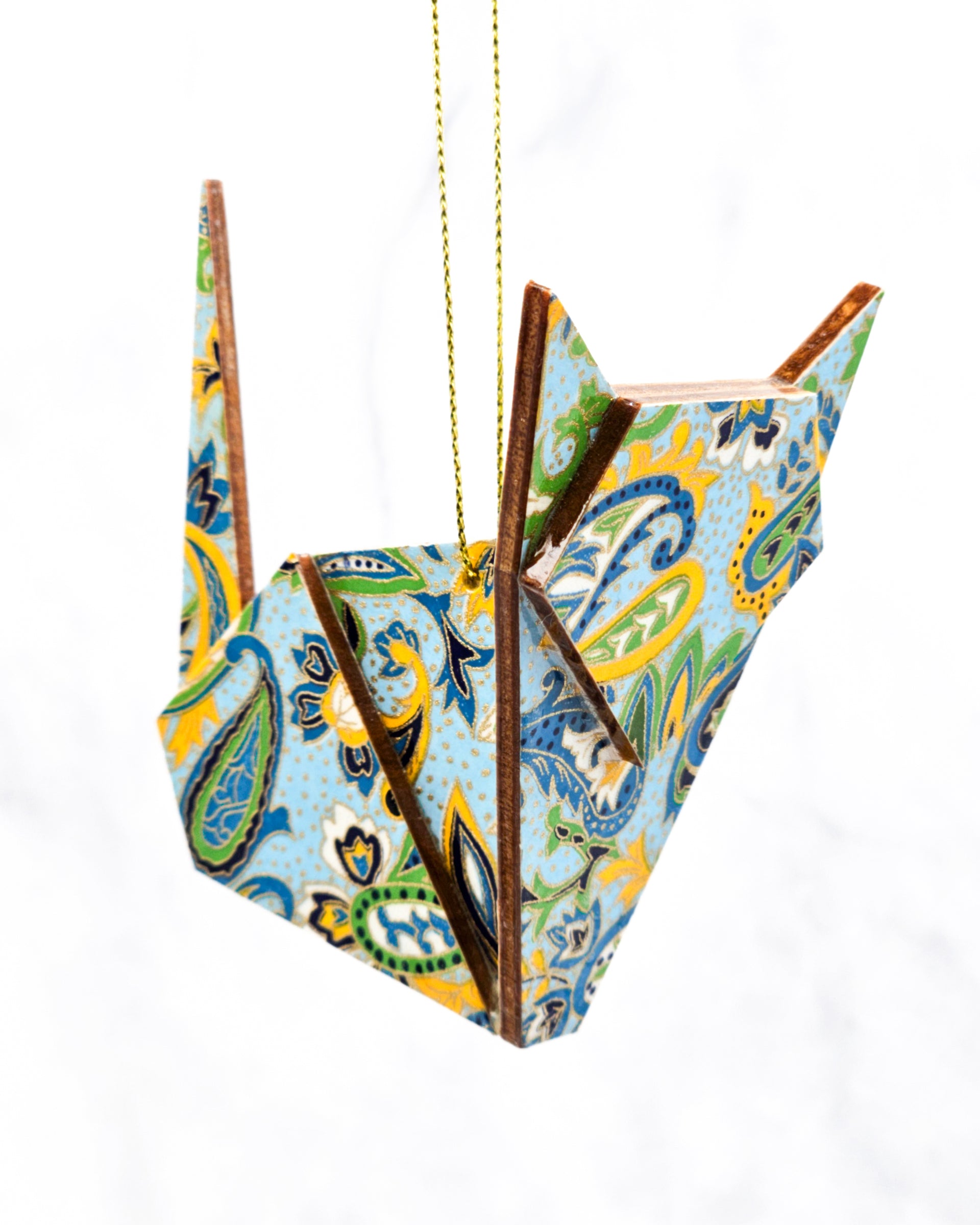 These light-weight origami cats are handmade from laser-cut wood and Japanese chiyogami paper. They can hang as an ornament or be displayed on a desk/shelf. They are well sealed by hand for durability. Even though they are water resistant due to the many layers of sealant, please do not soak them in water or display outdoors. Displaying in areas with prolonged direct sun exposure may cause the colors to fade over time. The cats are fragile and delicate parts may break if dropped on a hard surface, so please handle with care. These cats will last for a long time with proper care.