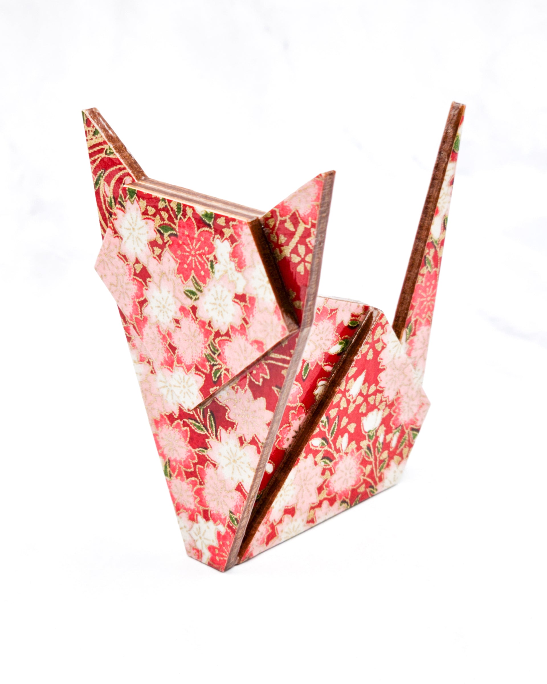 Wooden Origami Cat - Red & White Cherry Blossoms on Red