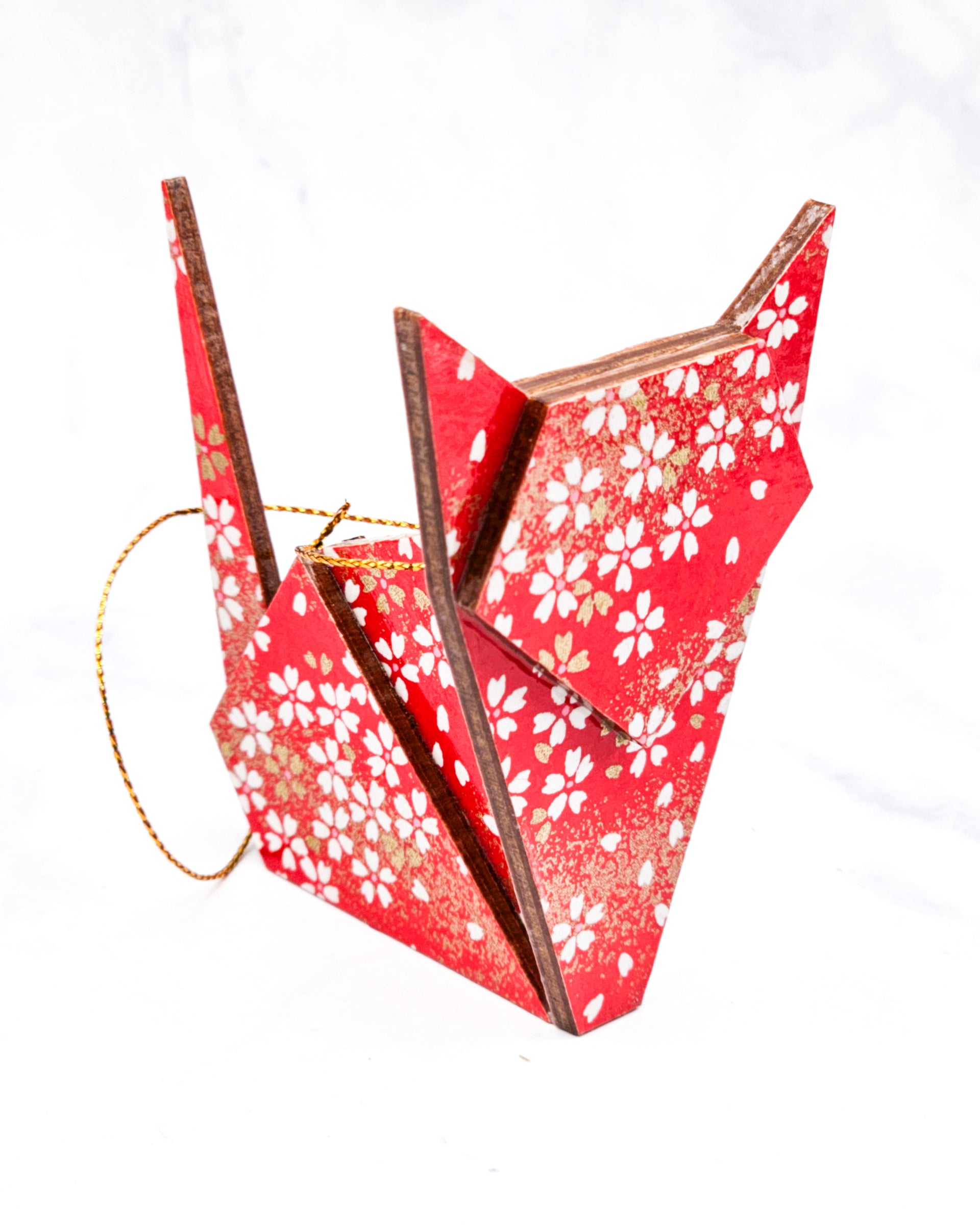 Wooden Origami Cat - White & Gold Cherry Blossoms on Red