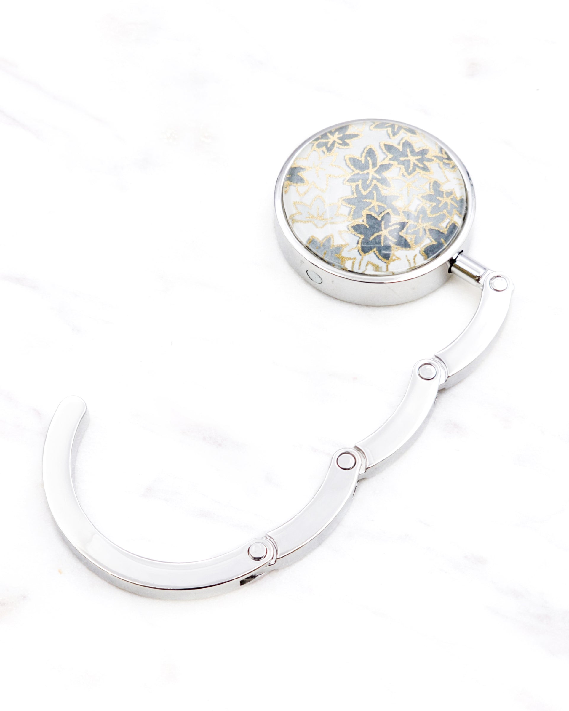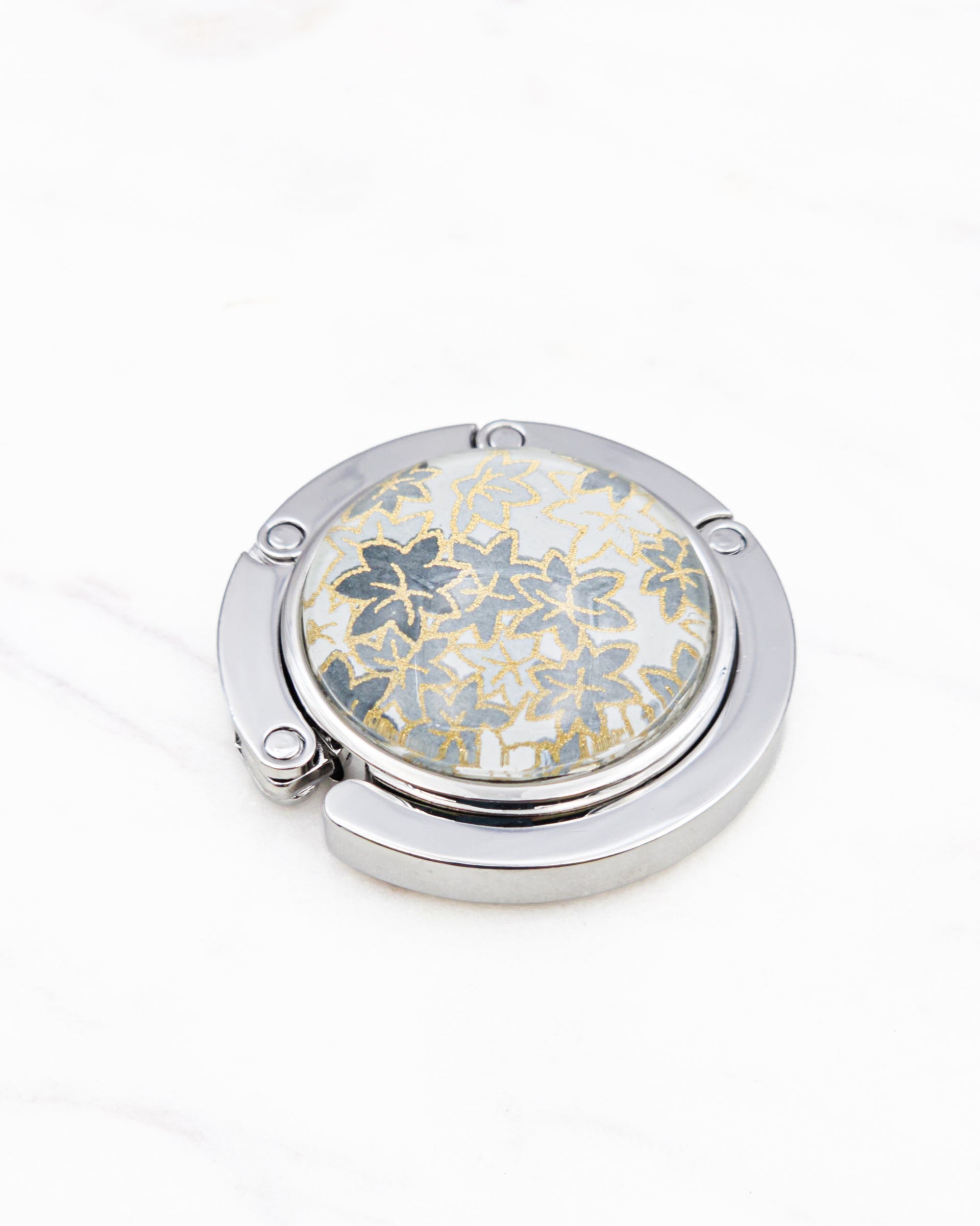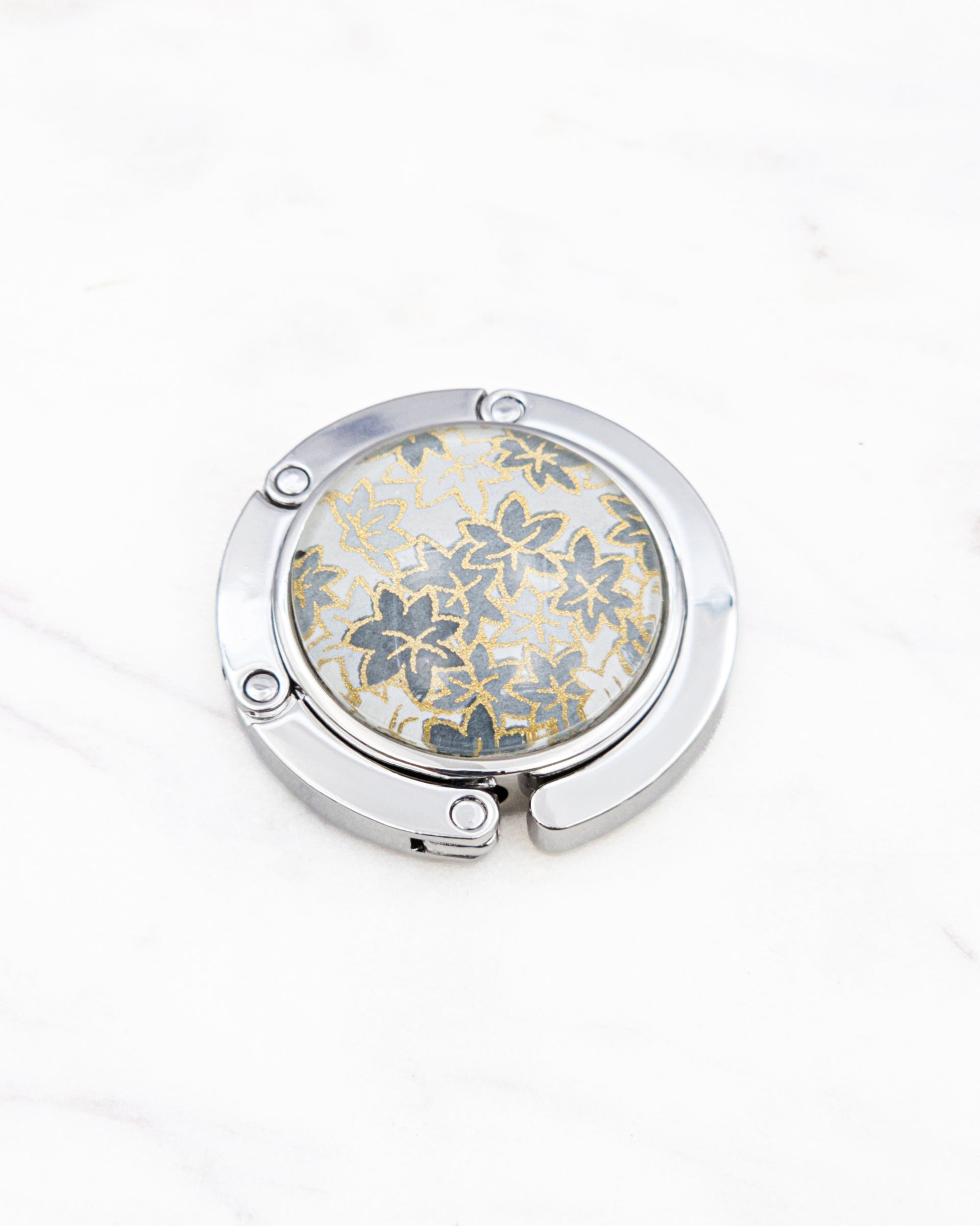 This silver folding tabletop bag hanger is decorated with beautiful authentic Japanese yuzen (chiyogami) paper. The design is protected under a glass dome. The hook folds up and is kept closed with a small magnet on the side. This compact design is perfect for small pockets in bags or purses. The bottom is covered with an anti-slip rubber pad to protect the table.