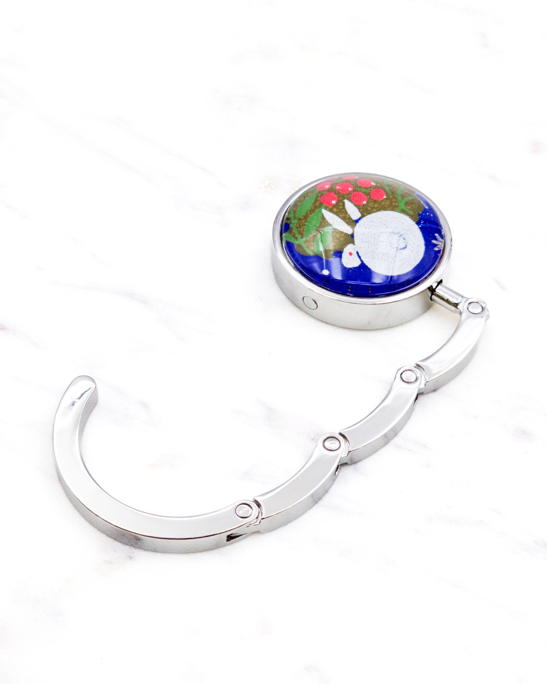 This silver folding tabletop bag hanger is decorated with beautiful authentic Japanese yuzen (chiyogami) paper. The design is protected under a glass dome. The hook folds up and is kept closed with a small magnet on the side. This compact design is perfect for small pockets in bags or purses. The bottom is covered with an anti-slip rubber pad to protect the table.