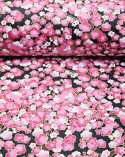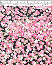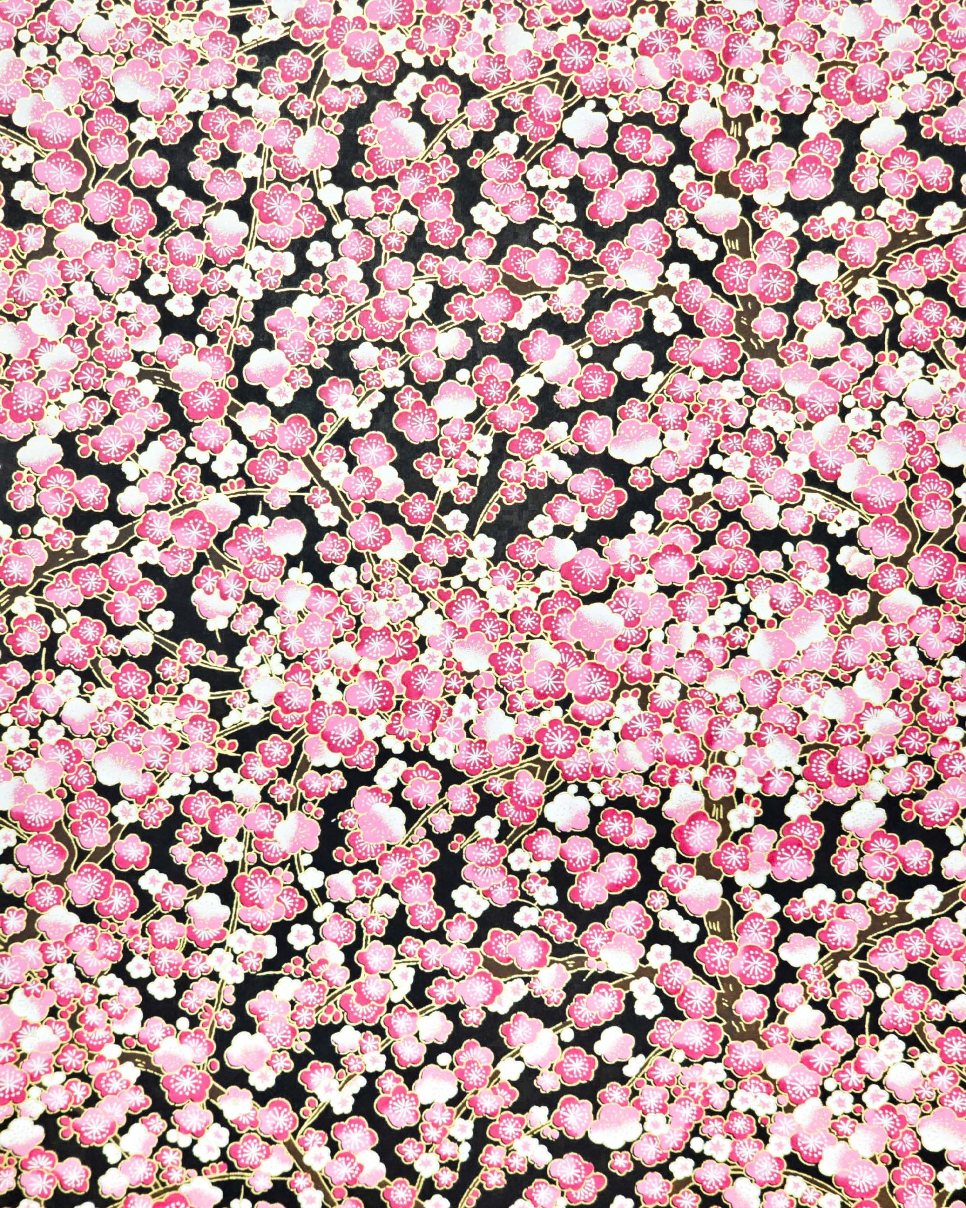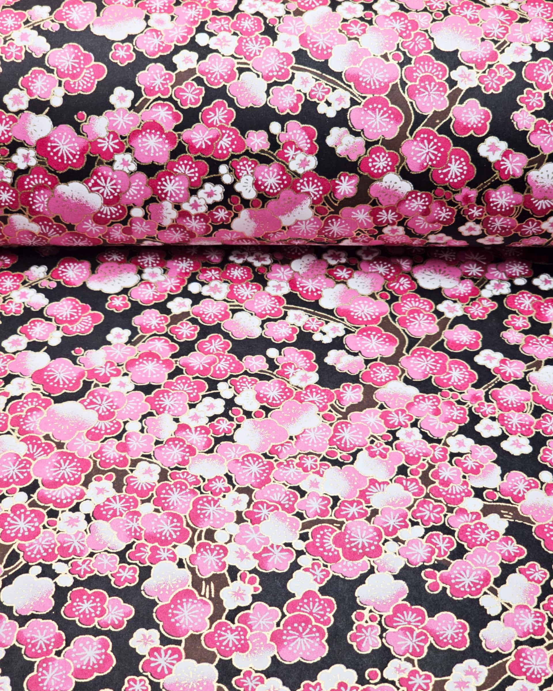 This design features a pink plum blossom tree on a black background with metallic gold accents.