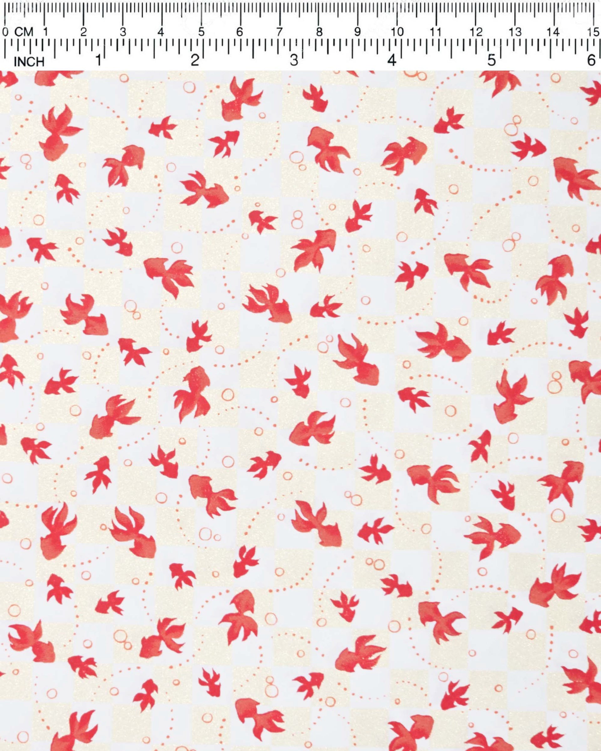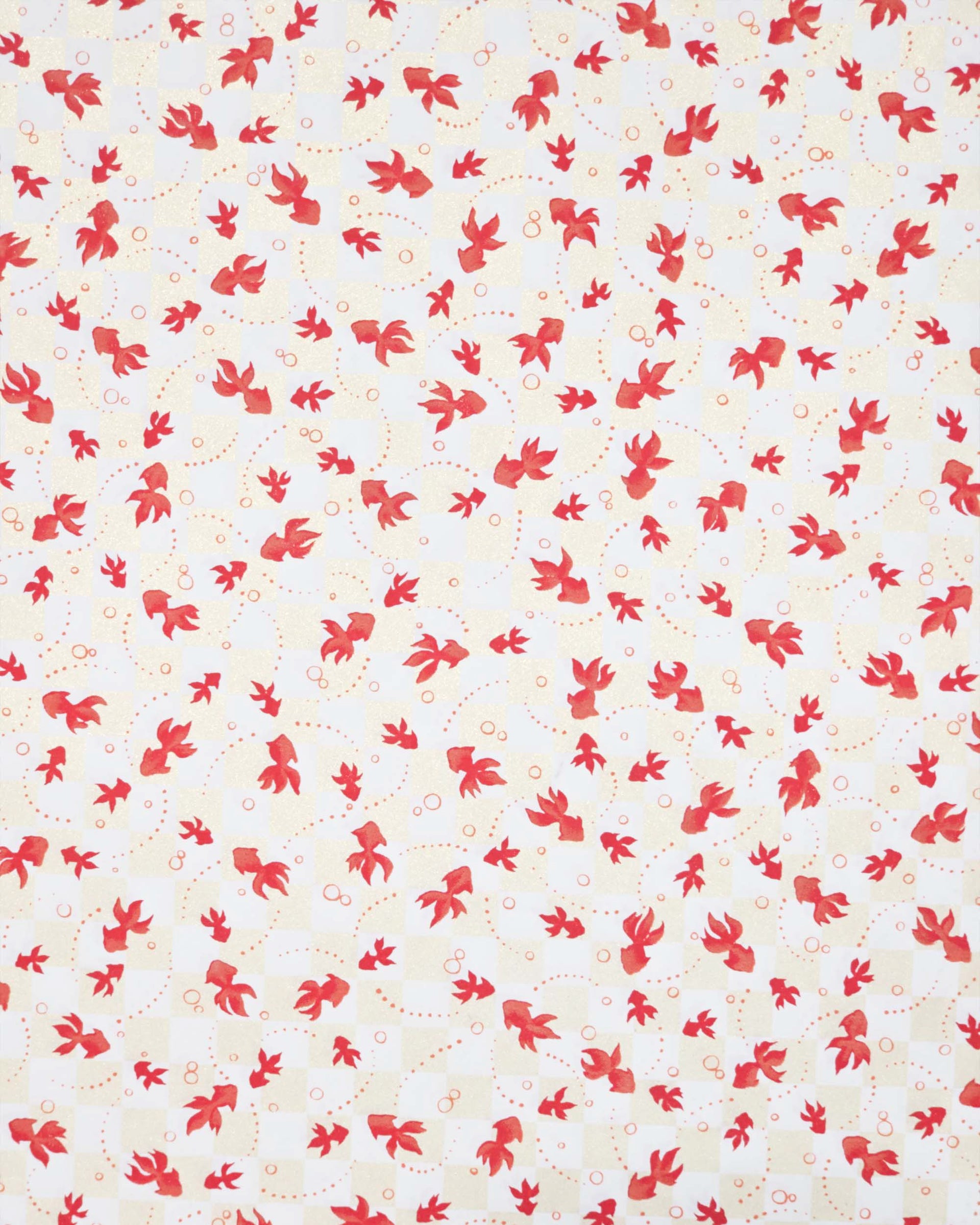 This design features red fishes on a white and pearlescent beige ichimatsu (checker) background.
