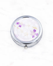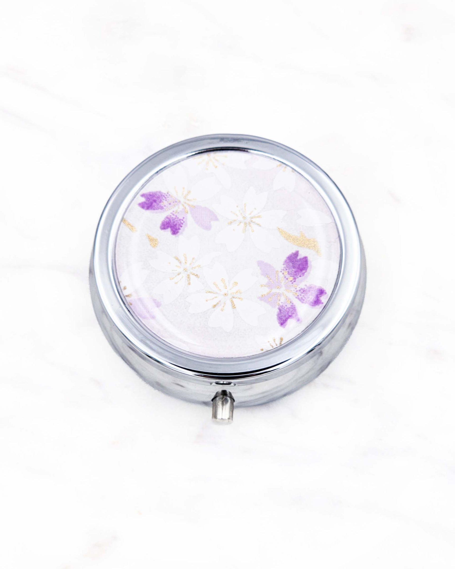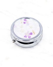 This silver folding metal pill box/case is decorated with beautiful authentic Japanese yuzen (chiyogami) paper. The design is protected under scratch resistant epoxy.